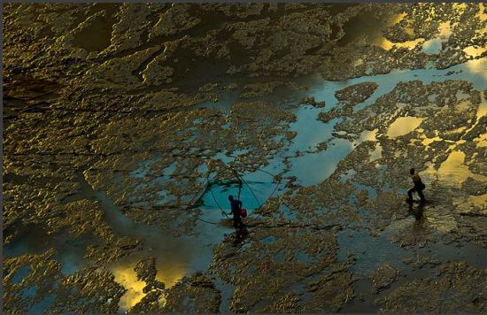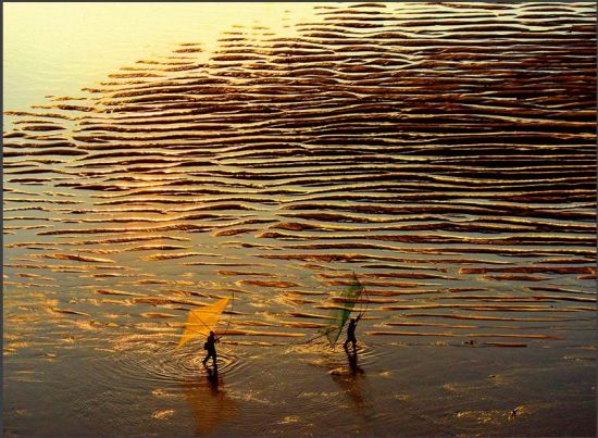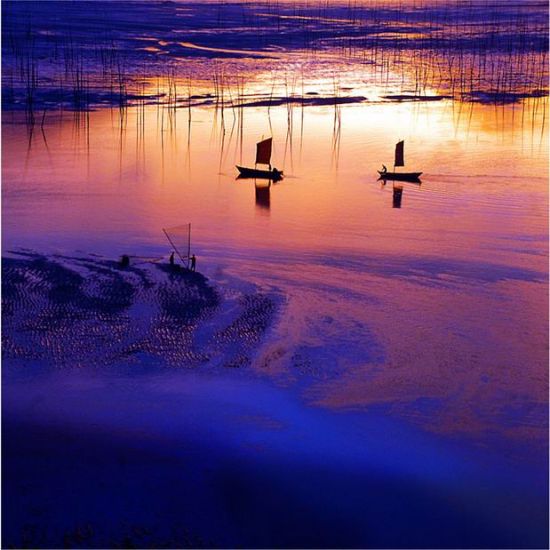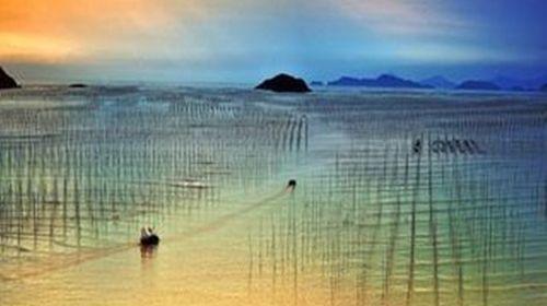 北岐是拍攝霞浦灘涂最精彩的一個拍攝景點(diǎn),距城關(guān)只有五公里。這里最有名的是虎皮樣的灘涂斑紋和滿灘滿海的竿影、人影和船影。漲潮時海上忙碌的船只穿梭在浮標(biāo)竿影(紫菜架)之間,與波光鱗鱗的大海、遠(yuǎn)山、島嶼渾然一體,尉為壯觀。退潮時海灘的紋理漸顯秀質(zhì),勞作的漁民游動在虎皮灘上,使得這片灘涂更具韻律美和動態(tài)美。此刻無論從哪個角度觀賞拍攝,取景框里都無法抗拒那些由光影變幻組合而成的五彩灘涂的誘惑力,這就是北岐灘涂吸引一批又一批國內(nèi)外圓眼大師為之折腰為之傾倒的魅力所在,是攝影人一生必拍的好景點(diǎn)。