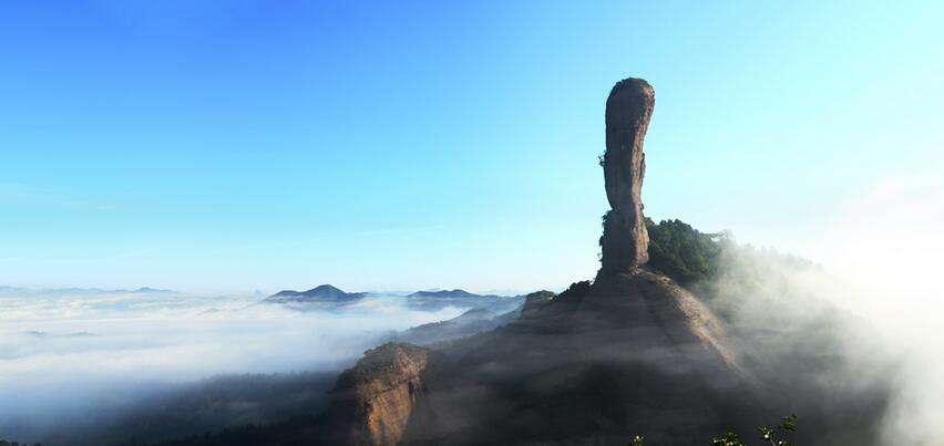 早上7:00出發(fā)赴棒槌山,預(yù)計(jì)7:20到達(dá)。拍攝棒槌山的獨(dú)具風(fēng)采的美景。頗為奇妙的是,磬錘峰半腰長(zhǎng)著一株高約3米的桑樹,據(jù)測(cè)這株桑樹與磬錘峰相親相愛已經(jīng)三百年了,據(jù)傳為我國(guó)最早之桑樹。峰下有一平臺(tái),東面斷崖有清代密宗雕像。