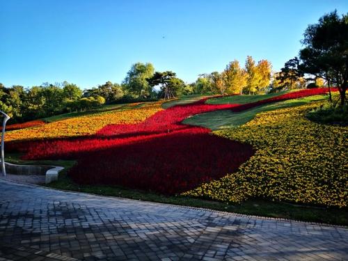 早上從延慶出發(fā),赴北京園博園。北京園博園園區(qū)布局為“一軸、兩點(diǎn)、五園”,“一軸”即園博軸,是貫穿主展區(qū)的景觀軸線。“兩點(diǎn)”即永定塔和錦繡谷。永定塔為遼金風(fēng)格的仿古塔,高69.7米,是園博園的標(biāo)志性建筑;錦繡谷是將一個(gè)20多公頃的建筑垃圾填埋坑打造成了花團(tuán)錦簇的下沉式花谷?!拔鍒@”即傳統(tǒng)展園、現(xiàn)代展園、創(chuàng)意展園、國(guó)際展園和濕地展園,共有展園69個(gè)。