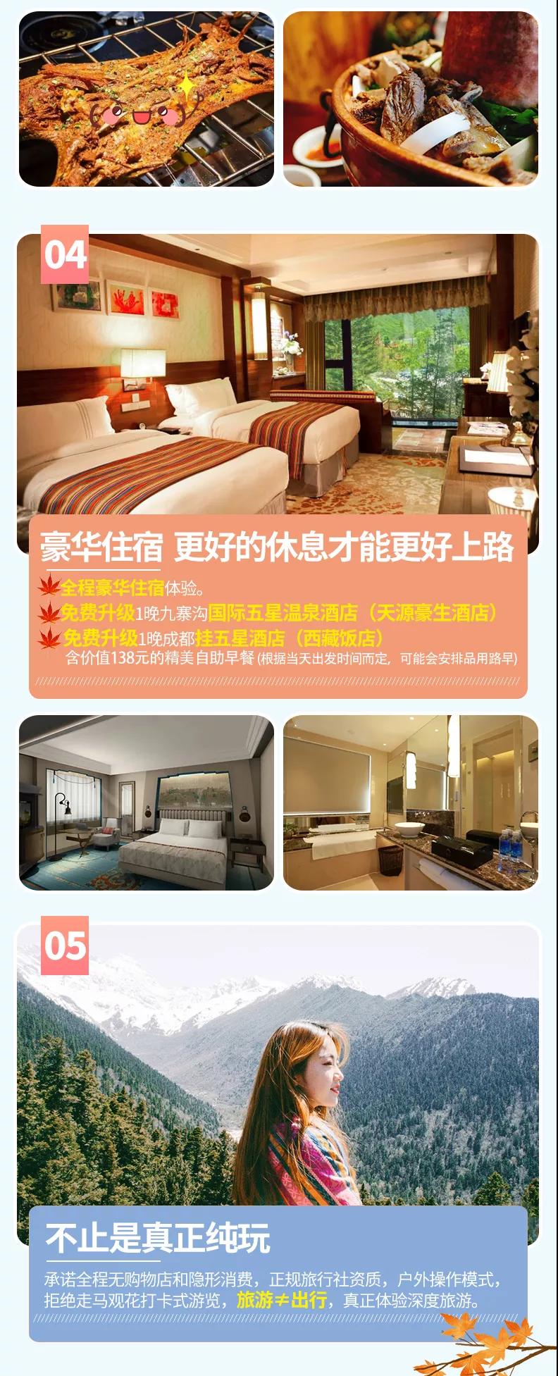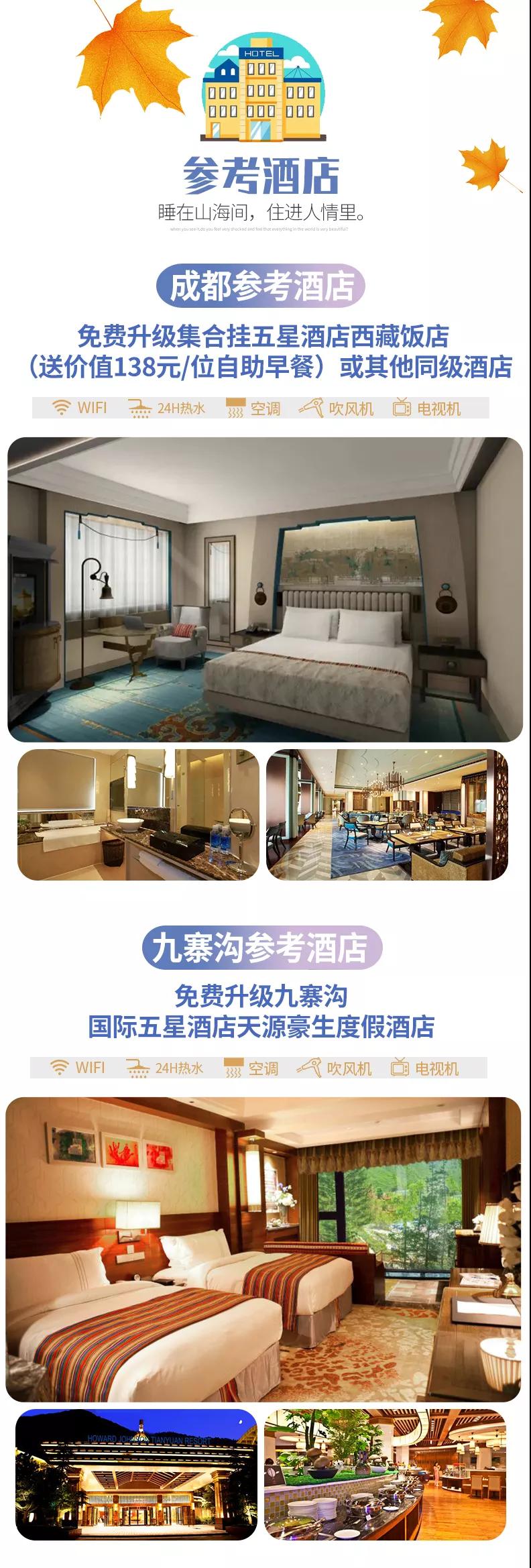 含全程4晚豪華酒店,免費(fèi)升級1晚成都掛五星酒店、九寨溝1晚國際五星酒店。參考酒店如下: