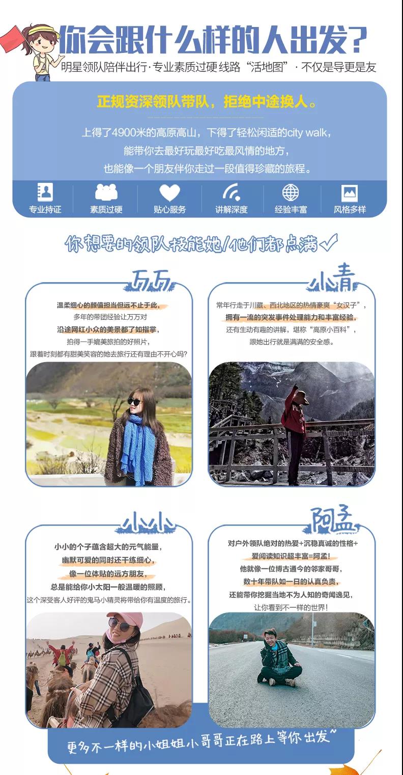 私人訂制:我們業(yè)務(wù)范圍囊括了全國各大城市,川西、西北、東北,在路上永遠(yuǎn)有我們的身影。我們將為每一個有定制需求的你策劃出獨(dú)屬于自己的完美旅行。