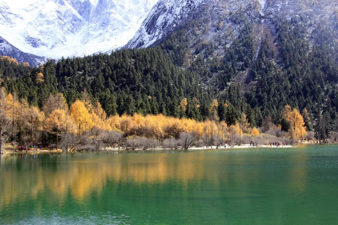 然后我們抵達(dá)被譽(yù)為“四季山水,山水世界”的旅游圣地——【畢棚溝】。秋天是畢棚溝景色最有層次的時候,遠(yuǎn)眺藍(lán)天山尖已戴白帽,山腰處卻還斑駁著枯黃與灰綠,濃綠的樹、深紅的葉、青青的湖、湛藍(lán)的天,此時的畢棚溝真正當(dāng)?shù)蒙弦粋€“五彩斑斕”。沿兩旁塞滿了楓樹、槭樹、鵝掌松、落葉松的小路踱步,遠(yuǎn)瞻奇特的萬年冰川,看奔騰不息的瀑布懸飛而下。這是離成都最近的最美秋色,畢棚溝金秋的層林盡染會告訴你,這一切都值得。