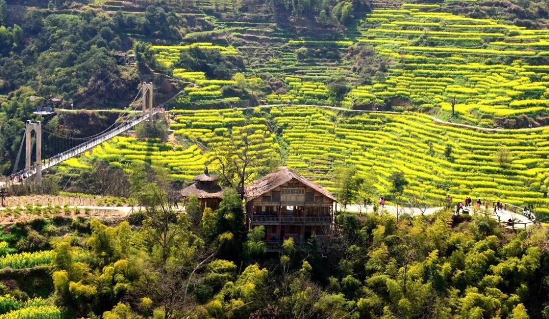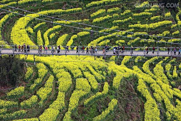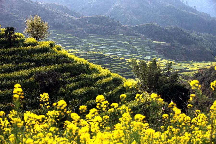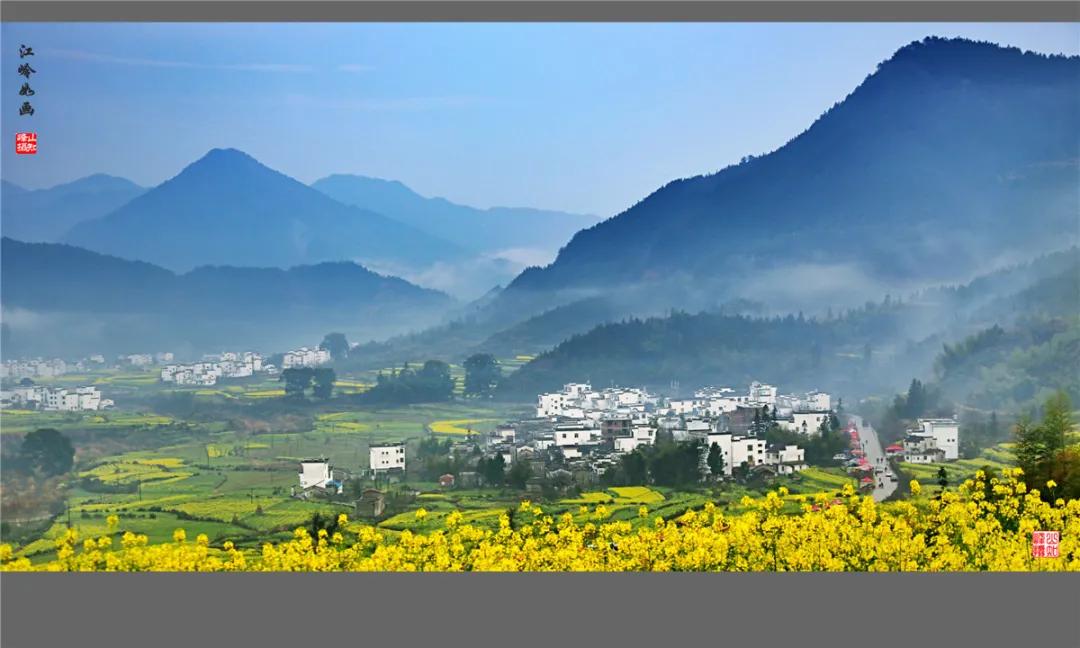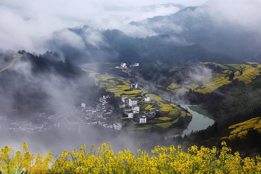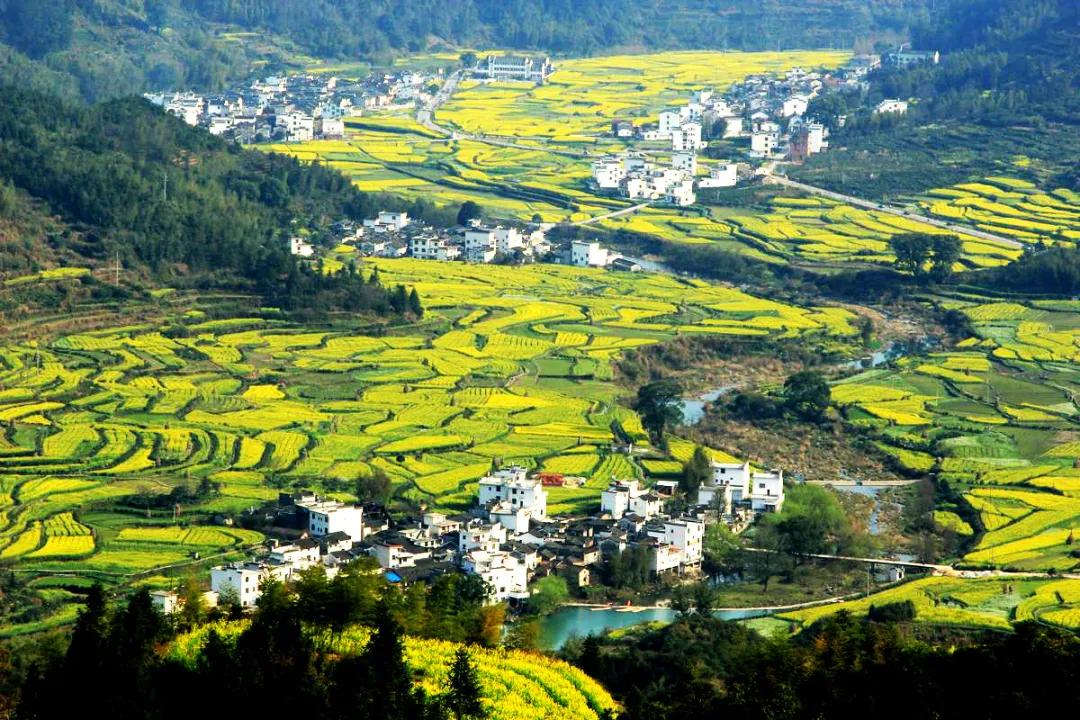 江嶺南臨曉起,東接溪頭,地處婺源縣最東北,是婺源最值得去的地方。站在山頂望去,腳下大片的山谷內(nèi),油菜花層層疊疊,一望無際,中間圍攏著幾個小小的村落,黑瓦白墻的徽派民居夾雜在一片金黃之間。