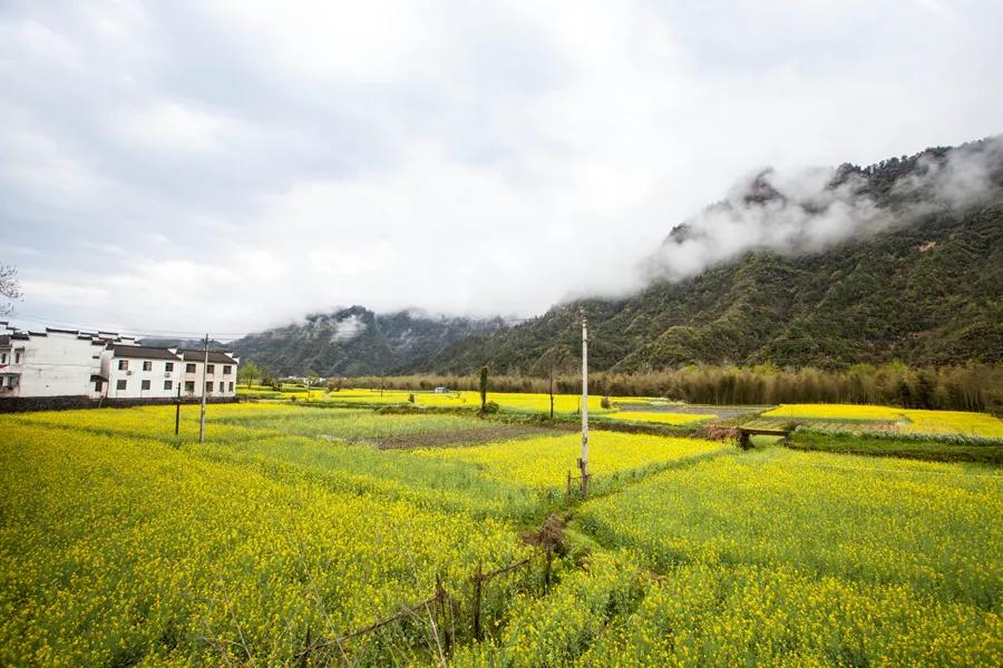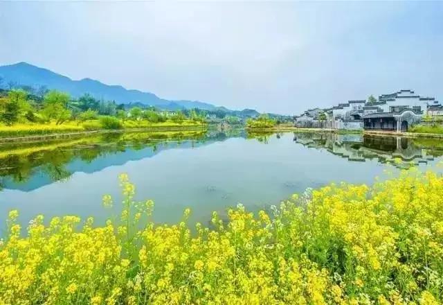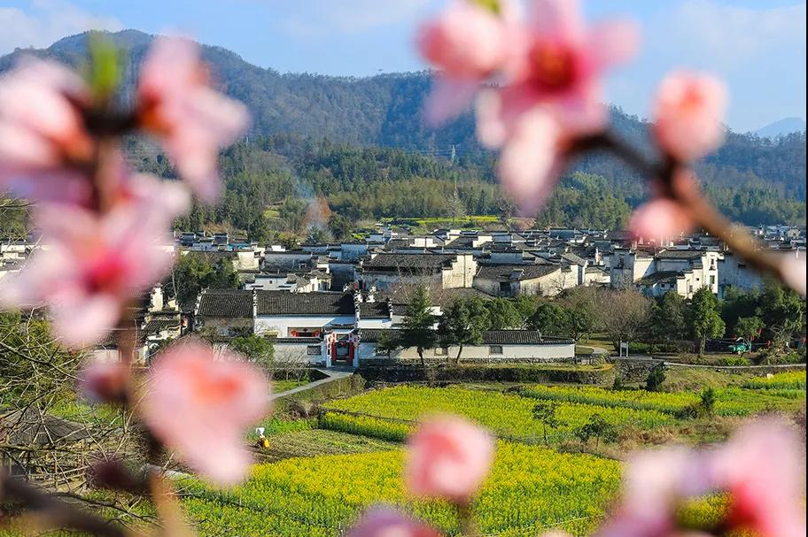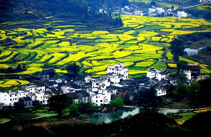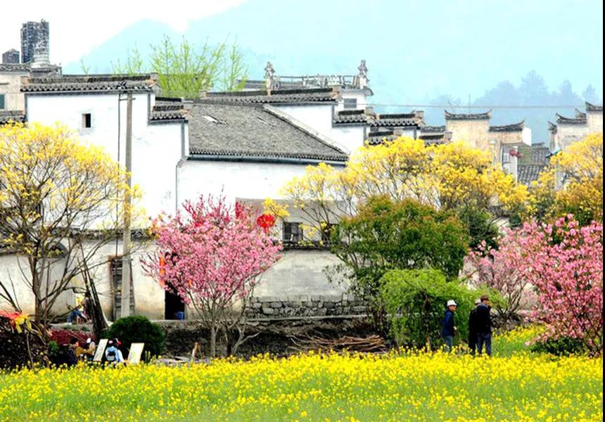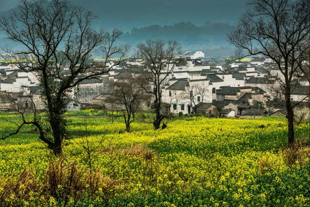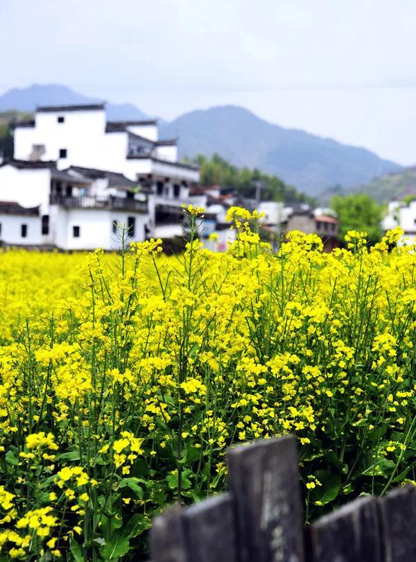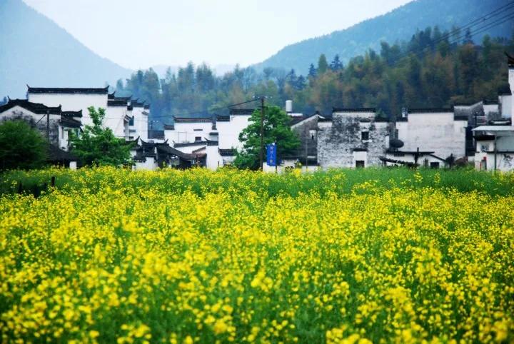 粉墻黛瓦的徽州古民居點綴于廣闊的油菜花叢中