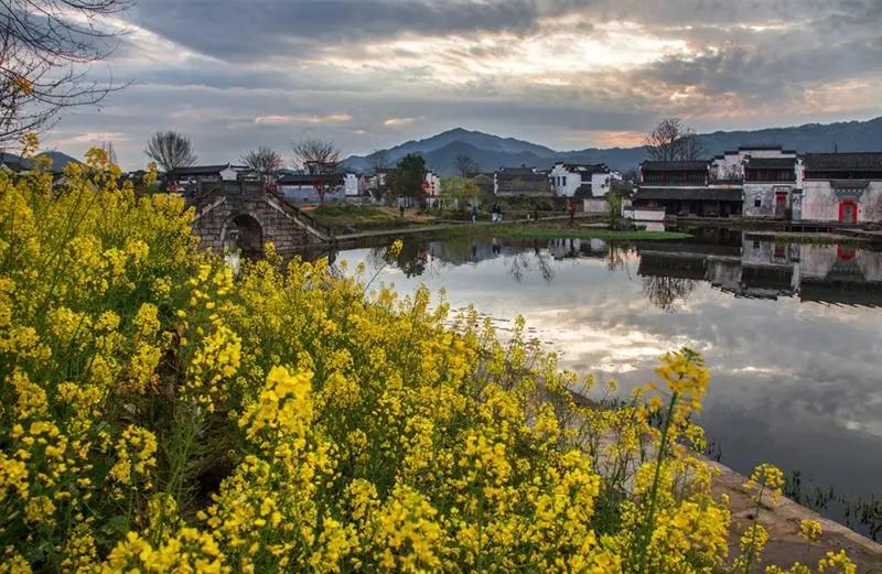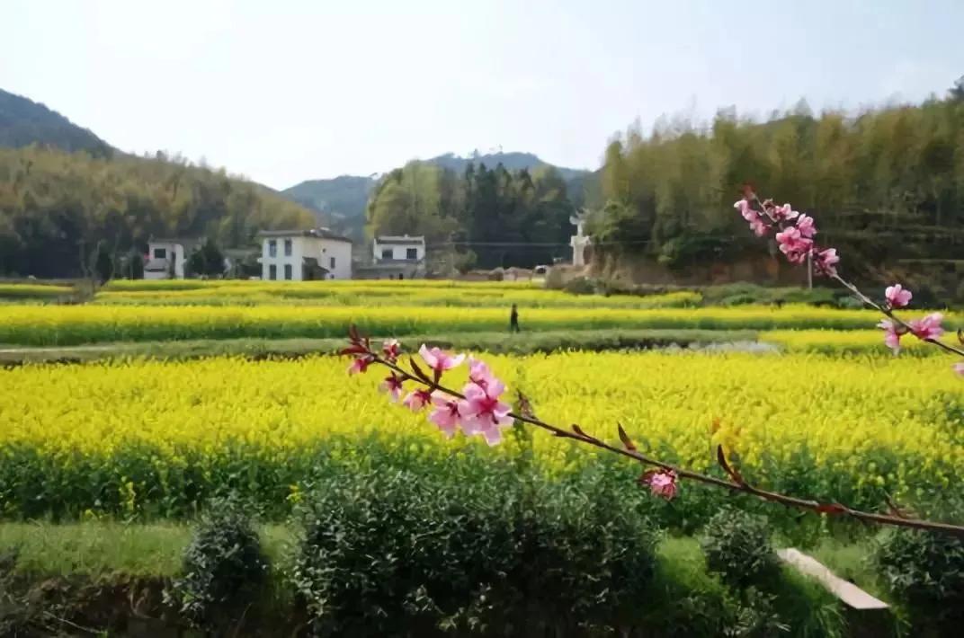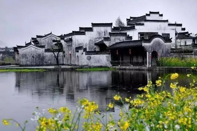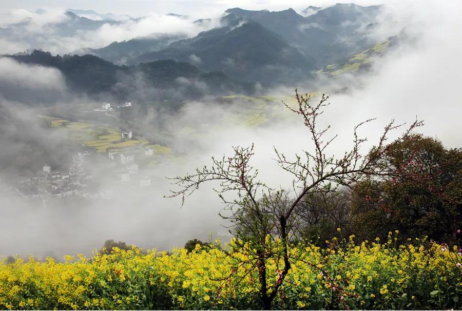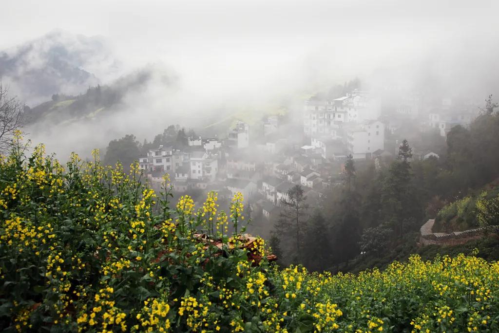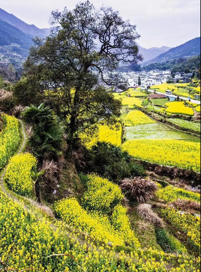 春天來臨時,漫天金黃的油菜花將水墨色的徽派建筑照耀著,白墻青瓦反射著微黃色的光,細(xì)看之下,還有幾枝桃花點綴其中。村里裊裊炊煙一直飄到了青色的山上,與山上的煙霧糾纏在一起。這大概才是徽州真正的模樣。