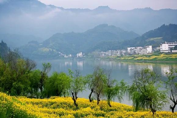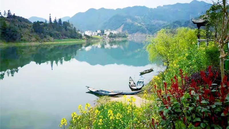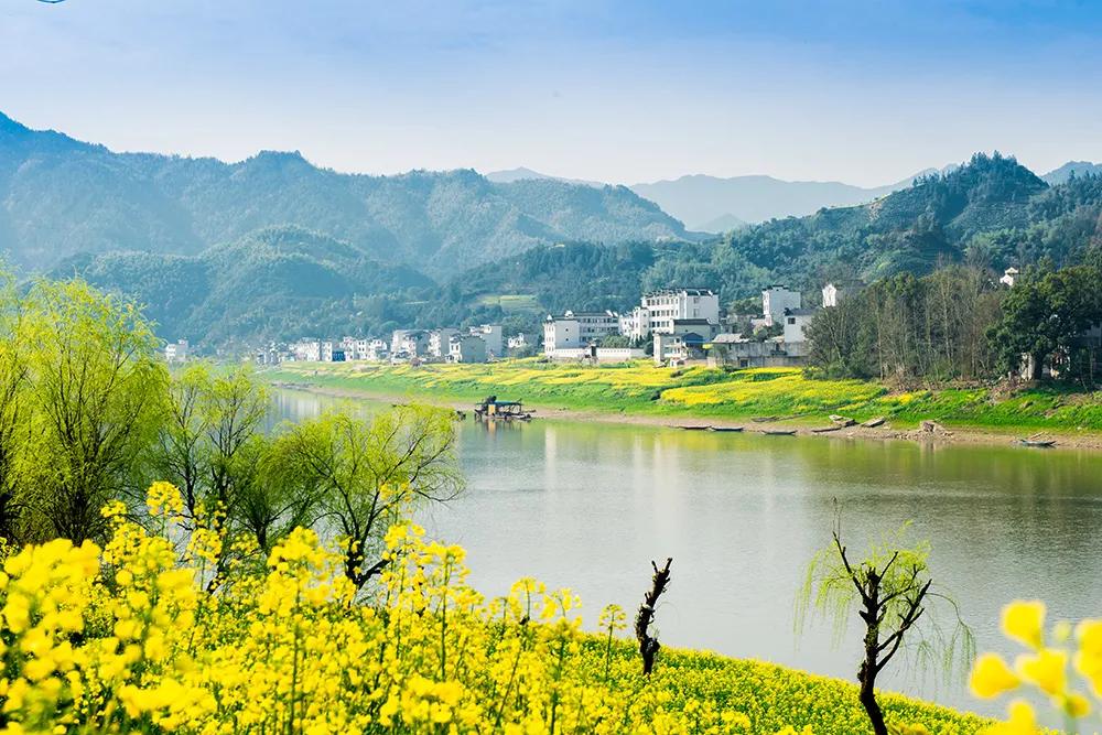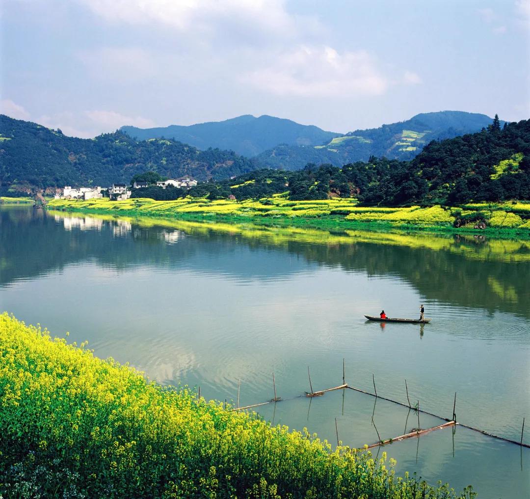 水色甄美,四季澄碧,沿江兩岸,青山蜿蜒,峰巒疊翠。船行在新安江上,兩岸樟桉疊翠,油菜花黃,粉墻黛瓦點綴其間,水墨徽州宛若天成!