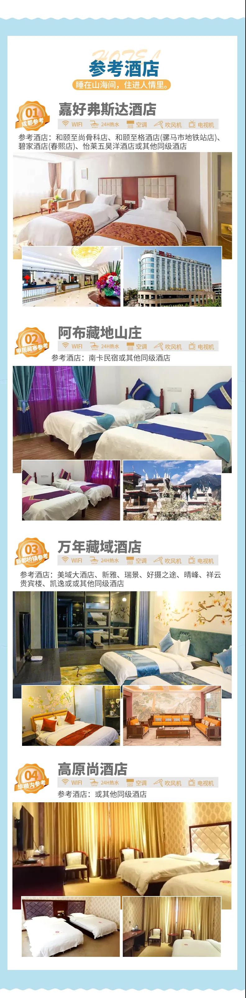 4、住宿:含全程5天4晚舒適酒店,確保酒店干凈衛(wèi)生,溫馨舒適。因沿途高原藏區(qū)條件有限,如果酒店設(shè)施沒(méi)有達(dá)到您的期望,敬請(qǐng)諒解。參考酒店如下(僅供參考,實(shí)際以訂房為準(zhǔn)):