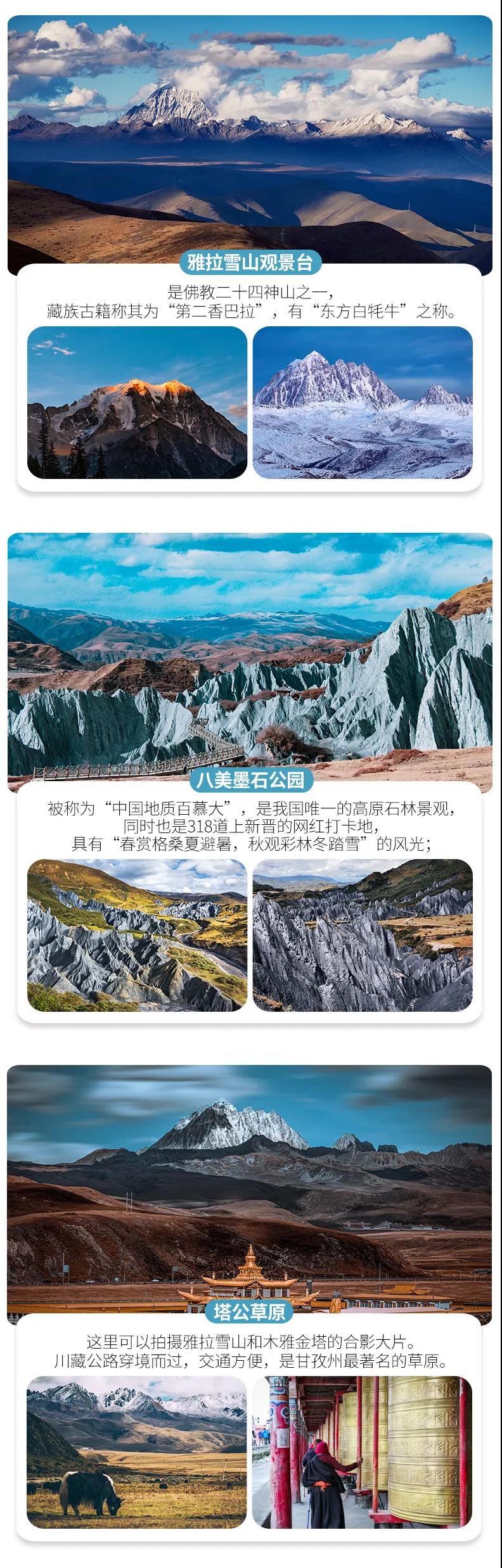 甲居藏寨 — 雅拉雪山觀景臺(tái) — 八美墨石公園— 塔公草原 — 瑪尼河谷 — 新都橋