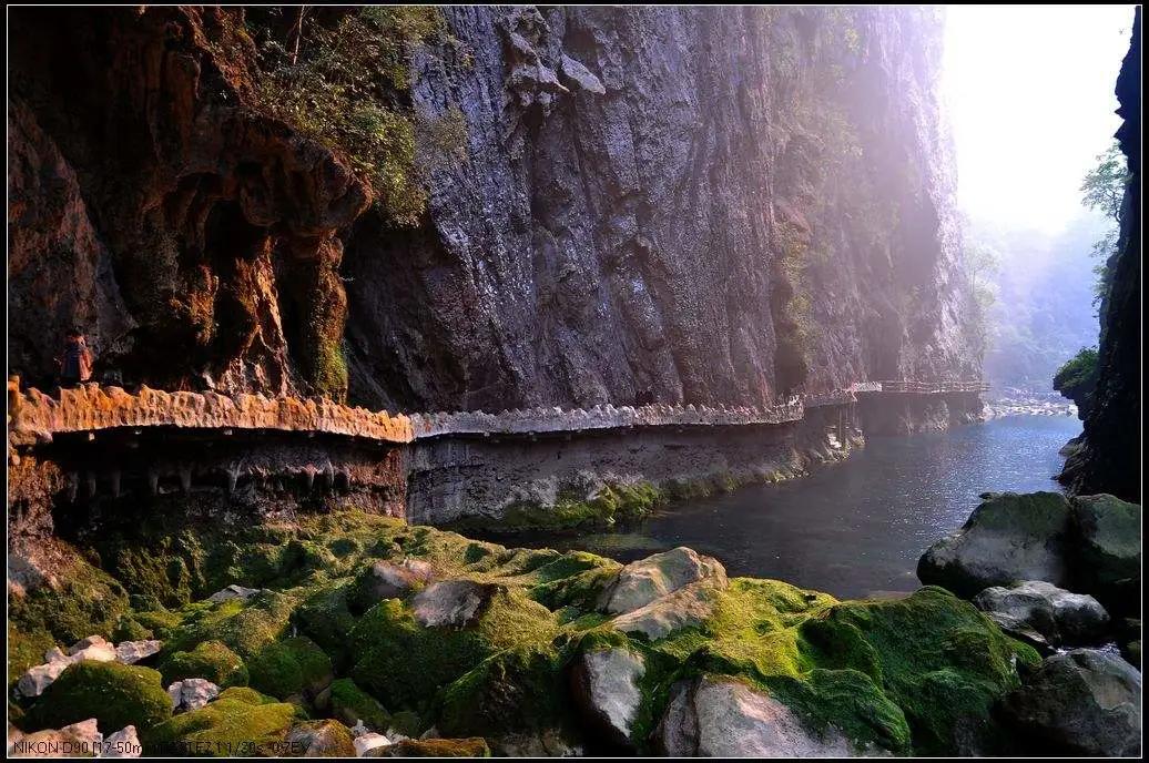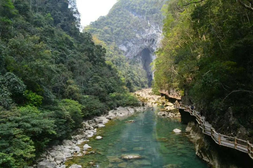 下午:后乘車前往游覽國(guó)家AAAAA級(jí)景區(qū)【大七孔】(游玩時(shí)間不少于2小時(shí));大七孔是以原始森林、峽谷、伏流、地下湖為主體的景區(qū),沿著恐怖峽打狗河直下,可見(jiàn)吊橋,右邊的棧道一面靠山,一邊臨水,蜿蜒曲折,凹凸不平。最為震撼的還是走過(guò)棧道的三分之二處,有一橫跨河兩岸的天然巨巖,是喀斯特是貌奇觀之一,俗稱天生橋,被專家們譽(yù)為“大自然神力所塑的東方凱旋門”,仰觀橋孔下,只見(jiàn)巨型鐘乳懸掛,橋腳、橋側(cè)的裂隙石縫長(zhǎng)出綠石草叢灌木,藤蘿花卉纏裹橋身,真是滿目琳瑯、五顏六色的天然大彩橋。