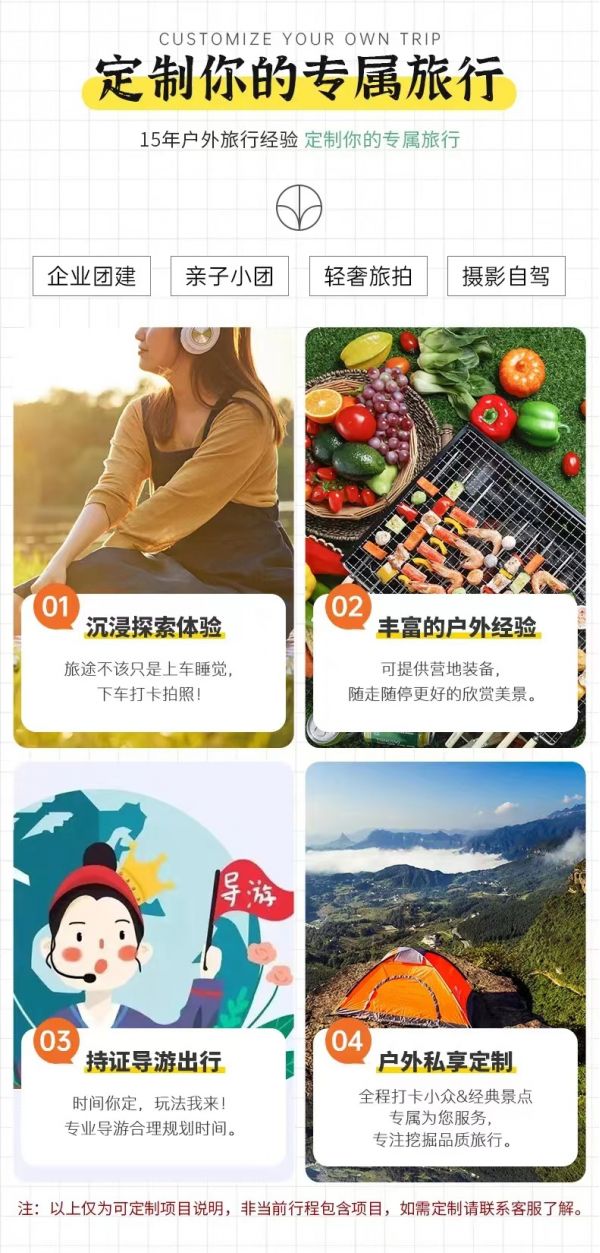 私人訂制:我們業(yè)務(wù)范圍囊括了全國各大城市,川西、西北、新疆,在路上永遠(yuǎn)有我們的身影。我們將為每一個有定制需求的你策劃出獨(dú)屬于自己的完美旅行。