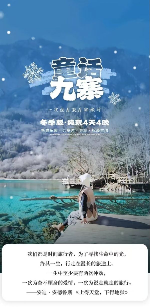 隨著季節(jié)的變化,九寨溝也呈現(xiàn)出不一樣的風姿;深秋的九寨溝享譽世界,只見漸次經(jīng)霜的彩林深淺相間、錯落有致,是“萬山紅遍,層林盡染”的最佳寫照,在漫山遍野濃烈的紅襯托之下,碧水更綠、藍天更藍,呈現(xiàn)出光怪陸離的水景;待入冬,莽莽林海都覆上皚皚白雪,林海雪原似玉樹瓊花,潔白、高雅,是觀賞九寨六絕之“藍冰”和“雪峰”的最好時機。也因這不二的美,這里也是許多熱門影視劇里的取景場地,今天我們就在這個大小熒屏收錄過的仙境來一場旅拍,由專業(yè)駐地攝影師為大家拍攝漢服/藏裝旅拍大片,每人2張精修電子照、底片全送,定格住旅程最美的瞬間。