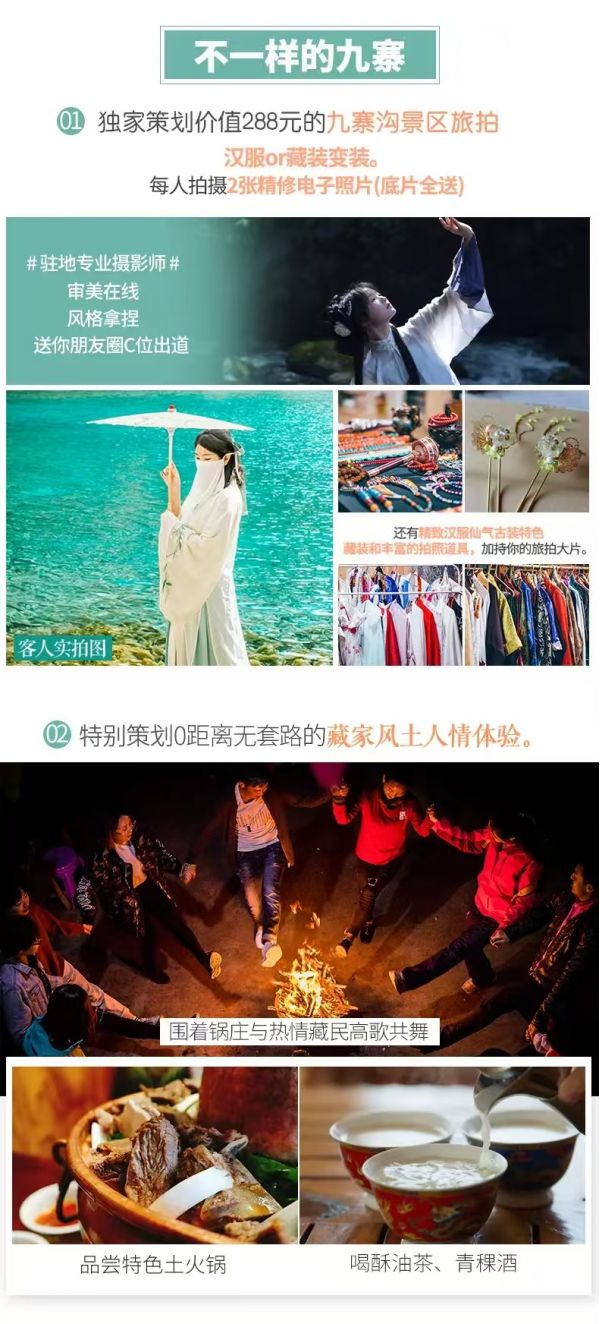 (1)獨家策劃九寨溝景區(qū)圣地旅拍,穿上漢服/藏裝,在圣地定格下最美的瞬間。