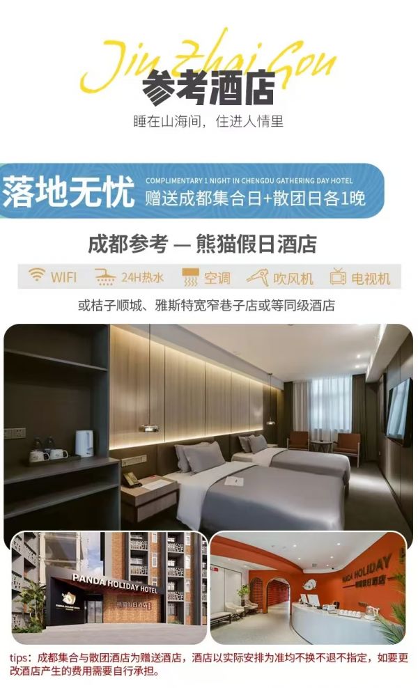 贈送成都集合日+散團日各1晚酒店:熊貓假日酒店、桔子順城、雅斯特寬窄巷子店或其他同級酒店