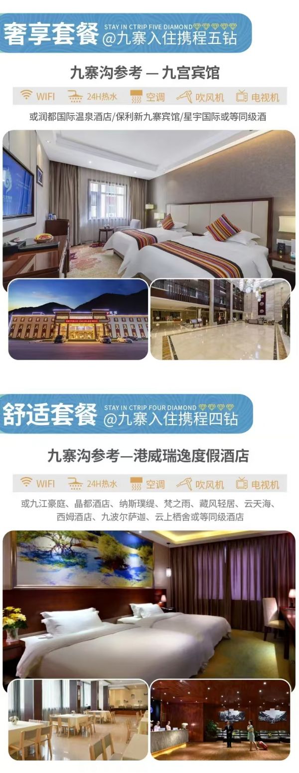 九寨溝:九江豪庭/港威瑞逸/晶都酒店/納斯璞緹/梵之雨/藏風輕居/云天海/西姆酒店/九波爾薩迦/云上棲舍或等同級酒店