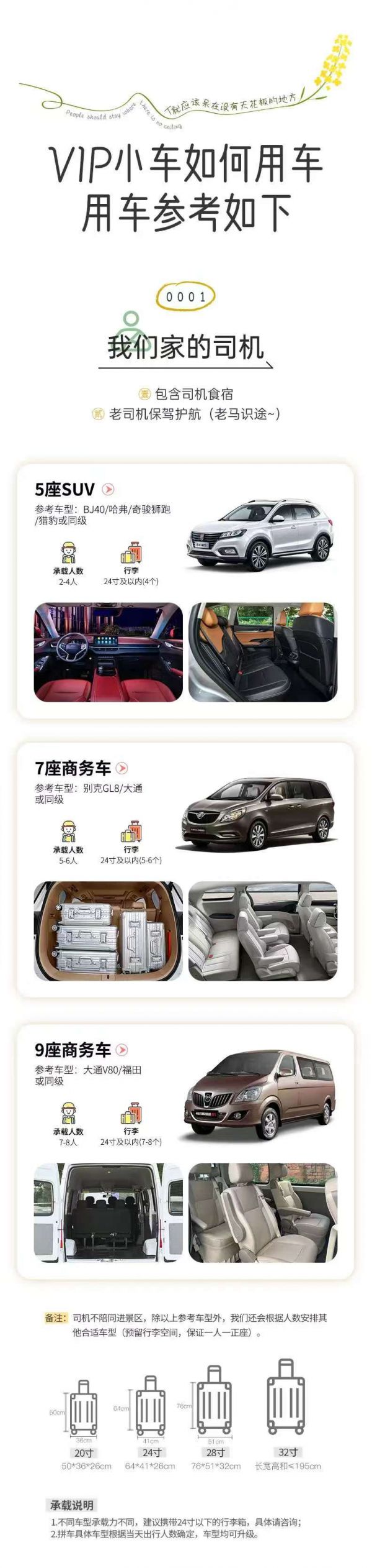 為保證成團及質量,根據(jù)人數(shù)派不同座位數(shù)用車,保證每人一正座;