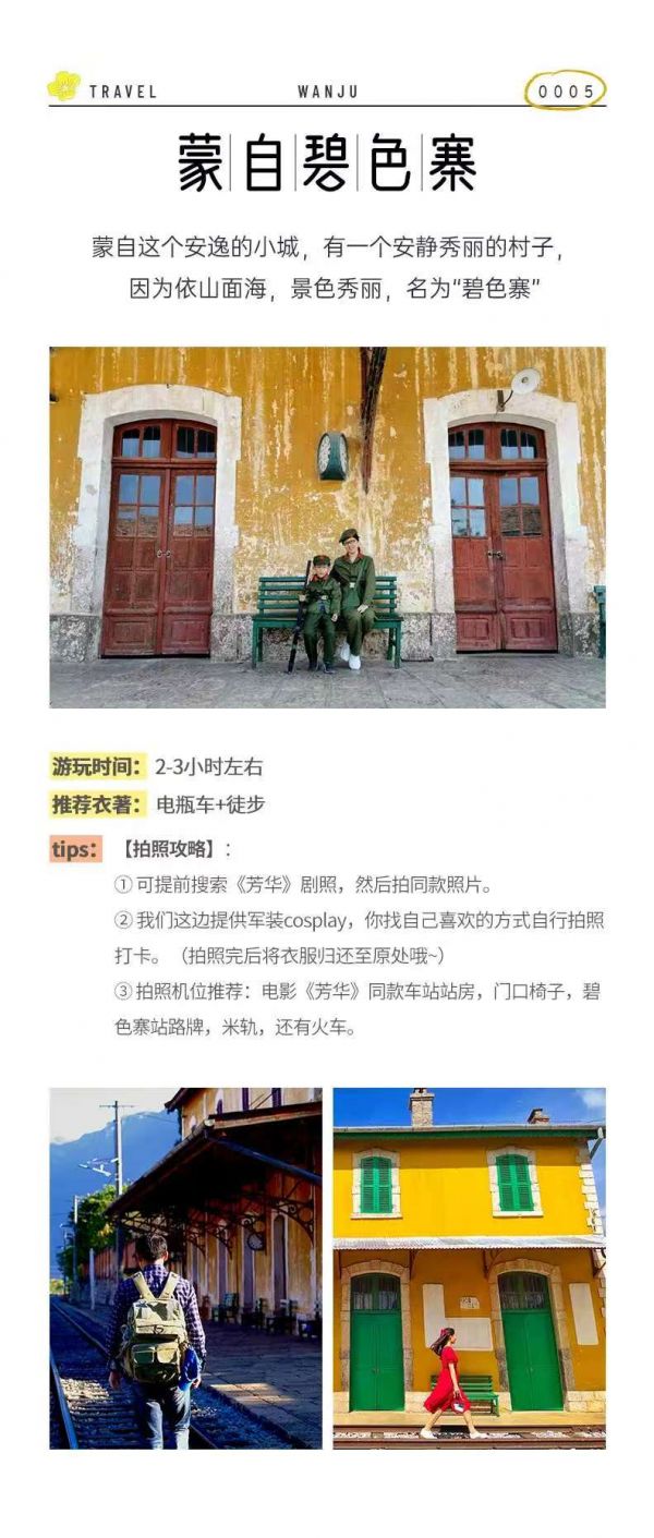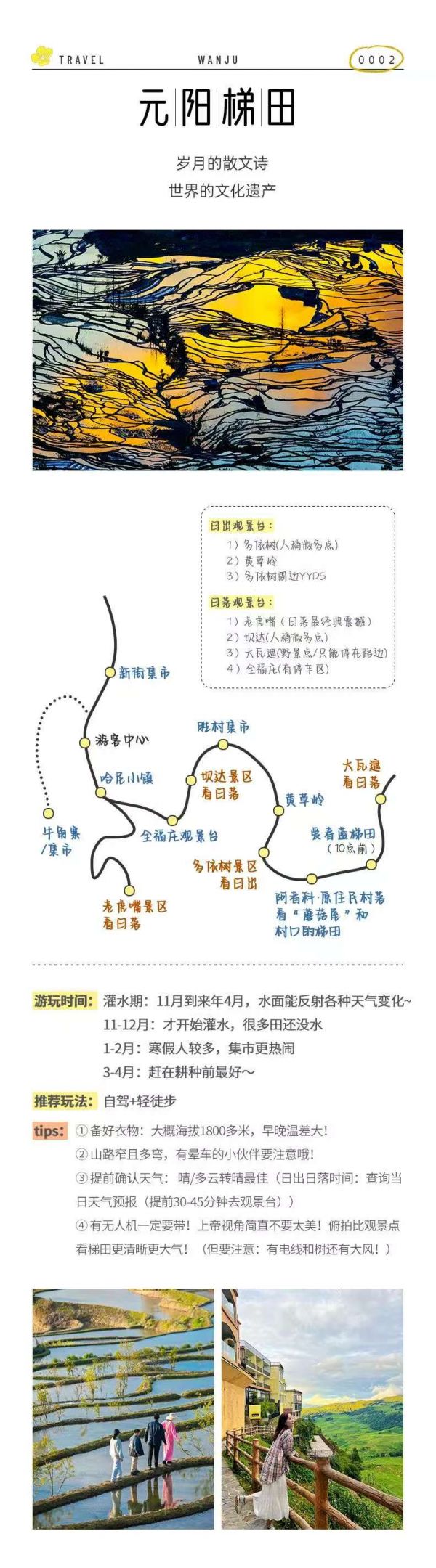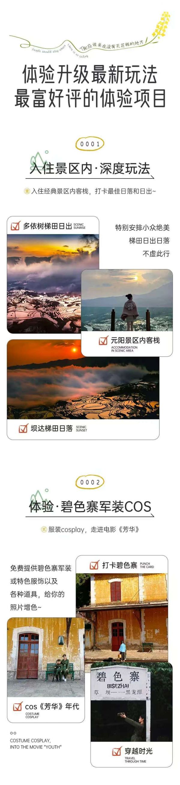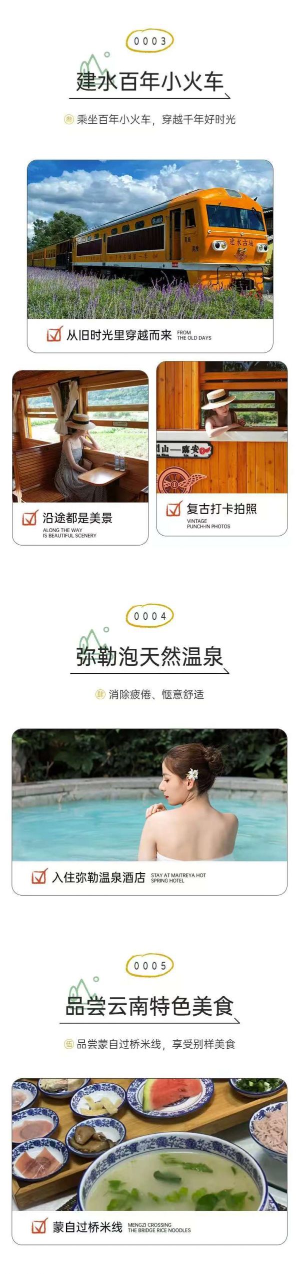 包含元陽景區(qū)門票(元陽現(xiàn)實行單點單獨檢票制,我們購買為單次門票,不能重復進入景區(qū),如果希望多次進入需另自費購門票)、 九龍瀑布景區(qū)門票、金雞嶺門票、蒙自電瓶車費、東風韻門票+景交、滇越小火車單程門票。