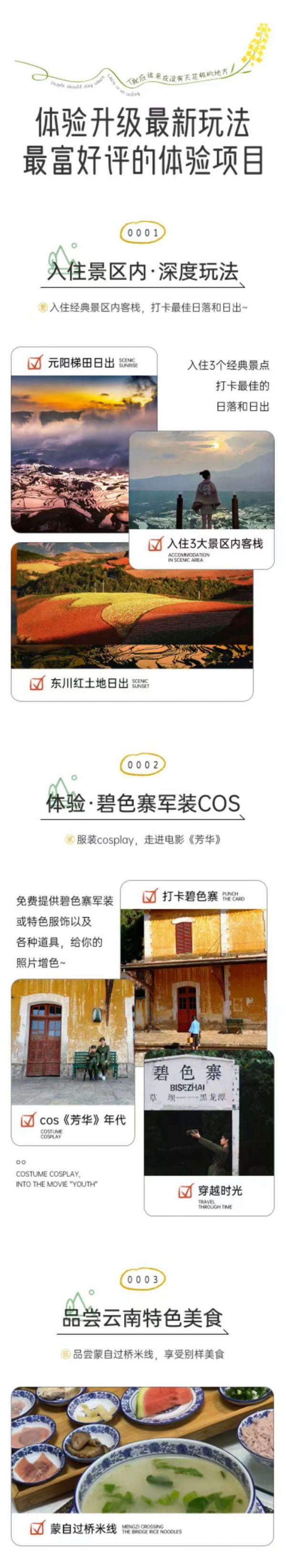 包含元陽(yáng)景區(qū)門(mén)票(元陽(yáng)現(xiàn)實(shí)行單點(diǎn)單獨(dú)檢票制,我們購(gòu)買(mǎi)為單次門(mén)票,不能重復(fù)進(jìn)入景區(qū),如果希望多次進(jìn)入需另自費(fèi)購(gòu)門(mén)票)、普者黑三生三世景區(qū)門(mén)票、金雞嶺門(mén)票、蒙自電瓶車(chē)費(fèi)、撫仙湖門(mén)票、螺絲田油菜花時(shí)節(jié)性門(mén)票。