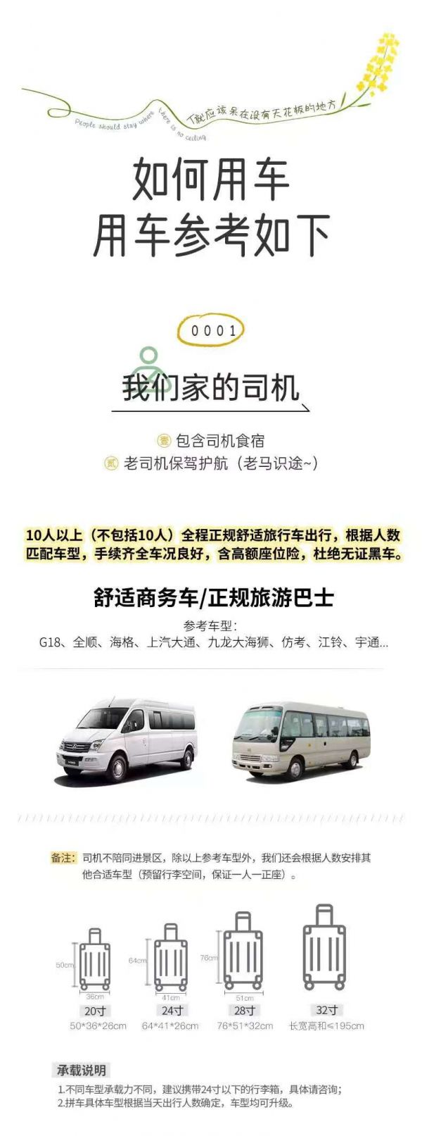 為保證成團(tuán)及質(zhì)量,根據(jù)人數(shù)派不同座位數(shù)用車(chē),保證每人一正座;