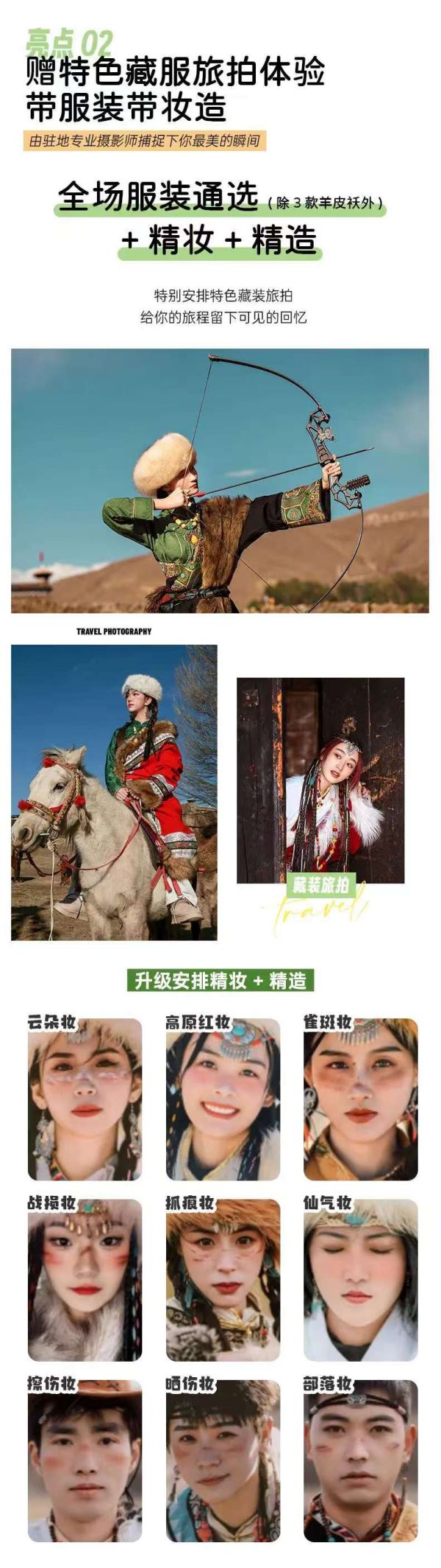 無(wú)人機(jī)+單反旅拍(底片全送+9張精修照片+1條精剪視頻),底片全程不低于40張,無(wú)人機(jī)視頻不低于3條(全車(chē)人拍攝旱地拔蔥視頻,晚上領(lǐng)隊(duì)帶大家星空拍攝);贈(zèng)送藏服旅拍(6張底片+3張精修),全場(chǎng)衣服通選(除了三款羊皮襖)+精妝+精造;隨車(chē)便攜式氧氣瓶每人2瓶、旅行三寶1套/人、撒隆達(dá)1份;隨車(chē)配備礦泉水、急救包、指尖血氧儀;贈(zèng)送特色土火鍋+篝火晚會(huì)+藏族歌舞表演晚會(huì);可免費(fèi)提供露營(yíng)桌椅板凳爐具,可以野餐(食材車(chē)上游客一起AA),需提前預(yù)約;體驗(yàn)藏區(qū)文化特色-畫(huà)唐卡;