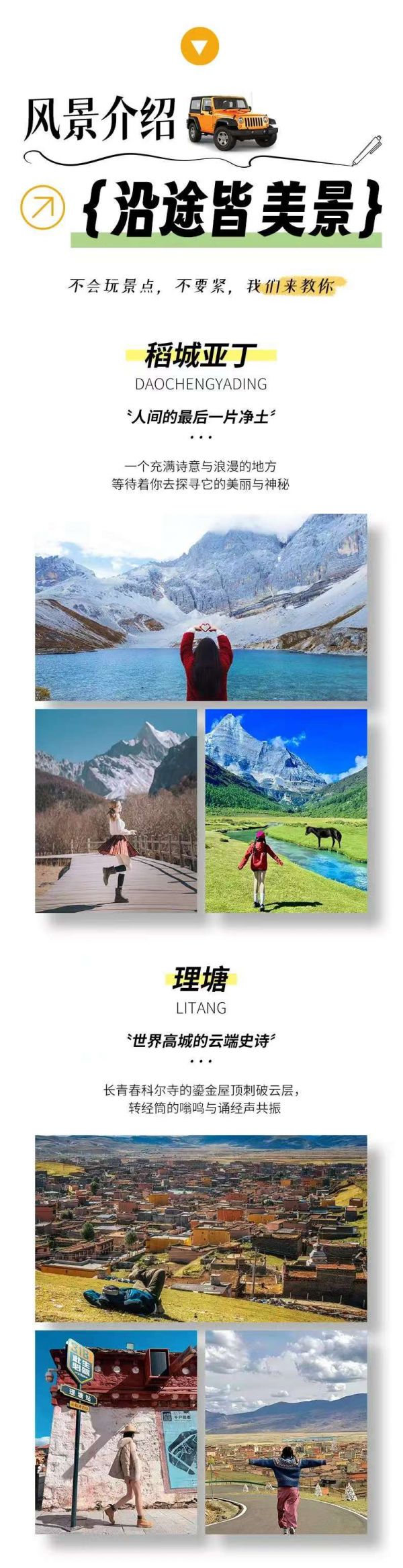 但領(lǐng)隊(duì)進(jìn)景區(qū)拍攝需要同車(chē)一起AA領(lǐng)隊(duì)門(mén)票費(fèi)用,門(mén)票預(yù)估:紅海子清潔費(fèi)15-30元/人;魚(yú)子西/格底拉姆/八郎生都清潔費(fèi)30元/人;稻城亞?。ㄍ緝r(jià)格)門(mén)票+觀光車(chē)266元/人、(淡季價(jià)格)門(mén)票+觀光車(chē)240元/人、沖古寺服務(wù)區(qū)至洛絨牛場(chǎng)電瓶車(chē)往返80元/人,單程50元/人(可選擇)、洛絨牛場(chǎng)往返騎馬費(fèi)用300元/人,價(jià)格隨季節(jié)浮動(dòng)(可選擇,不建議乘坐);理塘:套票100元/人。