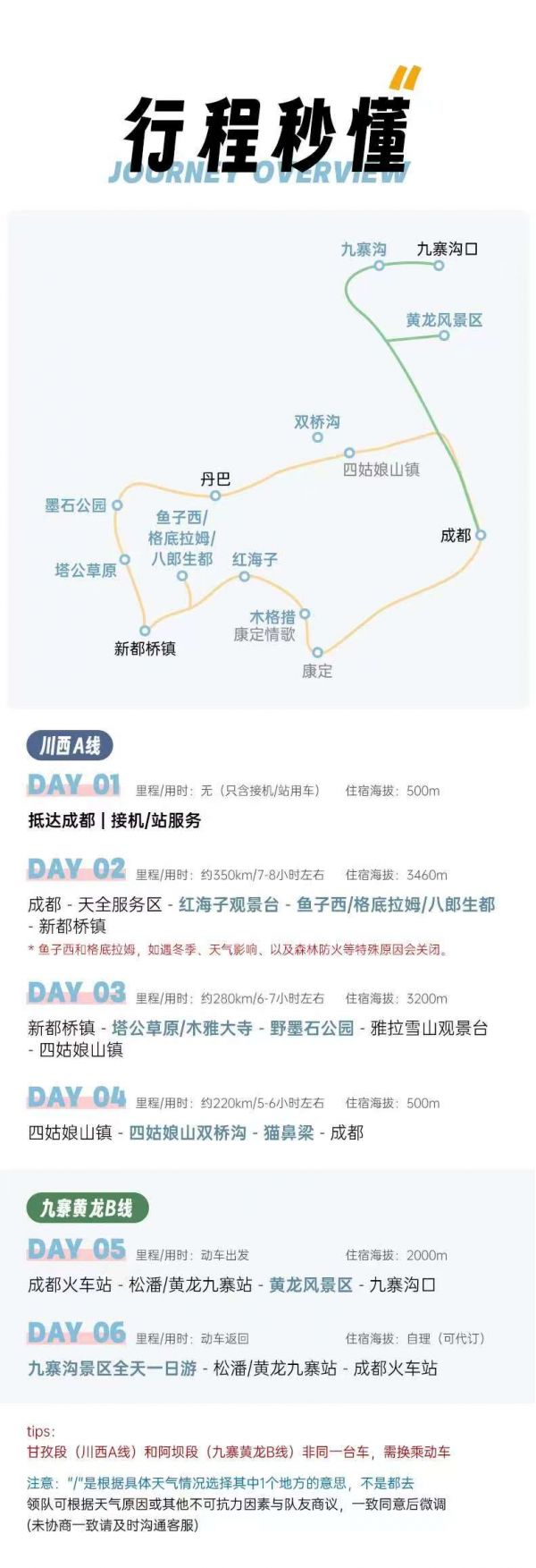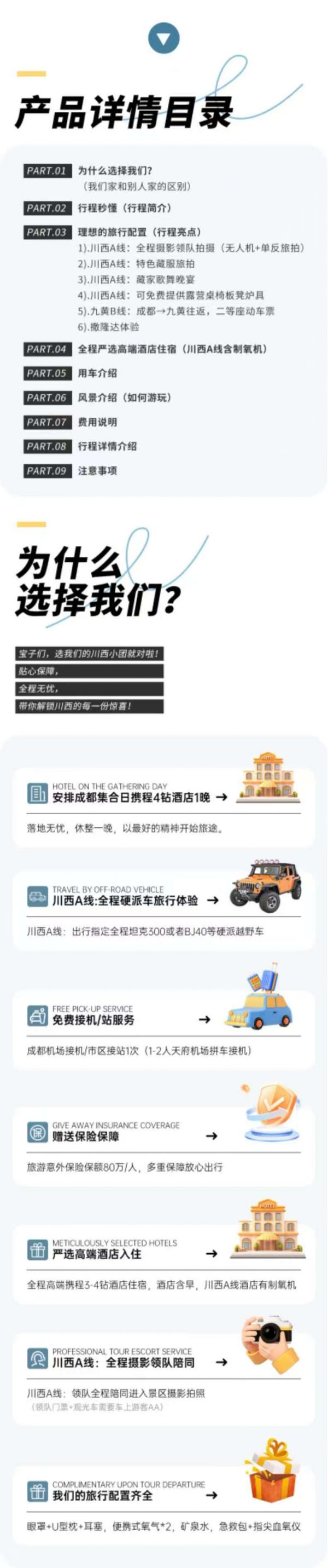 備注:以上項(xiàng)目僅限報(bào)名川西A線游客享有,報(bào)名九黃B線路游客不享受以上項(xiàng)目(川西A/B線包含如下:)包含成都機(jī)場接機(jī)/市區(qū)接站1次(1-2人天府機(jī)場拼車接機(jī));包含80萬旅游意外險(xiǎn)。