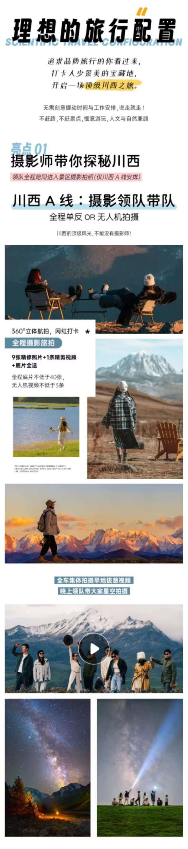 川西A線:隨車配備單反和無人機(jī)(行程隨車配備索尼/富士/佳能/尼康單反(均配置長焦鏡頭)和大疆御系無人機(jī))。