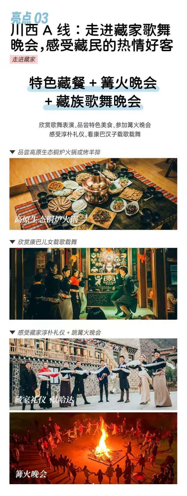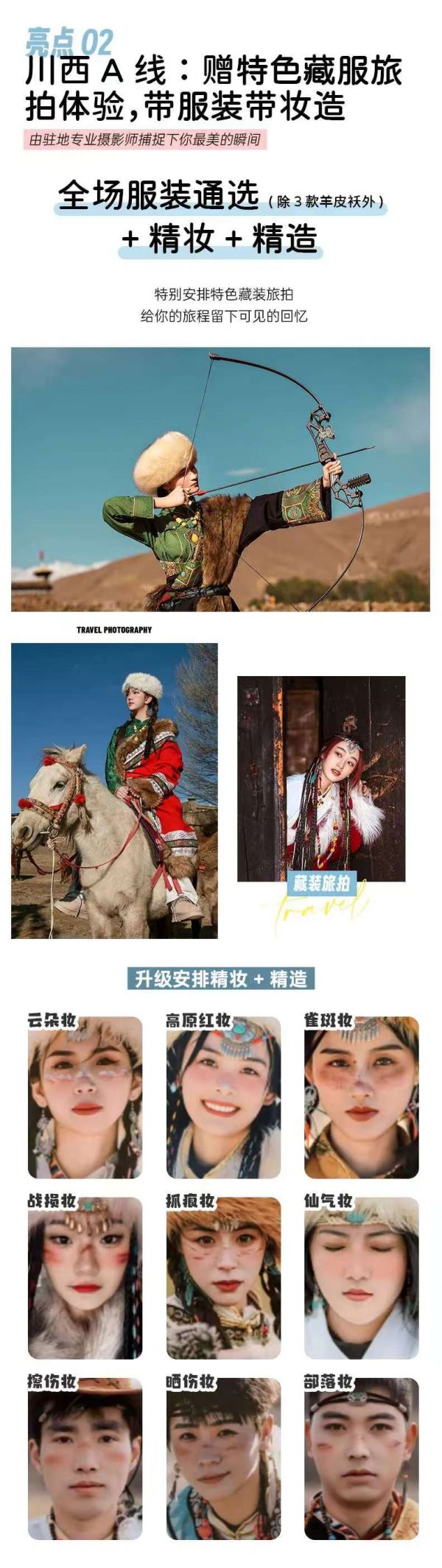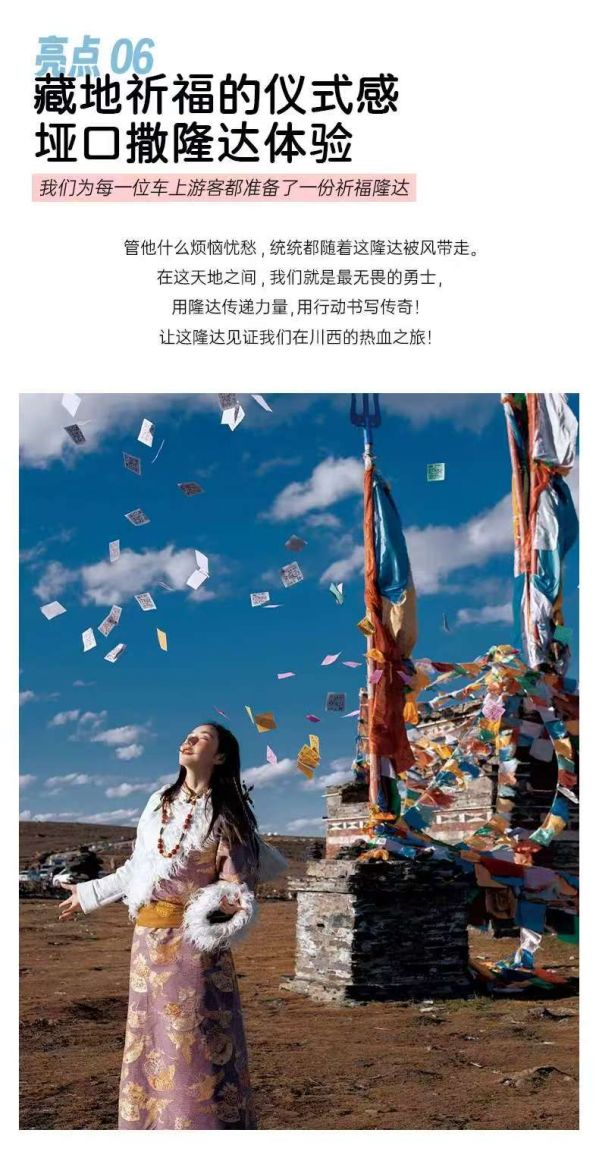無人機(jī)+單反旅拍(底片全送+9張精修照片+1條精剪視頻),底片全程不低于40張,無人機(jī)視頻不低于3條(全車人拍攝旱地拔蔥視頻,晚上領(lǐng)隊(duì)帶大家星空拍攝);免費(fèi)提供露營桌椅板凳爐具,可以野餐(食材車上游客一起AA),物資有限需提前預(yù)約;贈(zèng)送藏服旅拍(6張底片+3張精修),全場衣服通選(除了三款羊皮襖)+精妝+精造;隨車便攜式氧氣瓶每人2瓶、旅行三寶1套/人、撒隆達(dá)1份;隨車配備礦泉水、急救包、指尖血氧儀;贈(zèng)送特色土火鍋+篝火晚會(huì)+藏族歌舞表演晚會(huì);