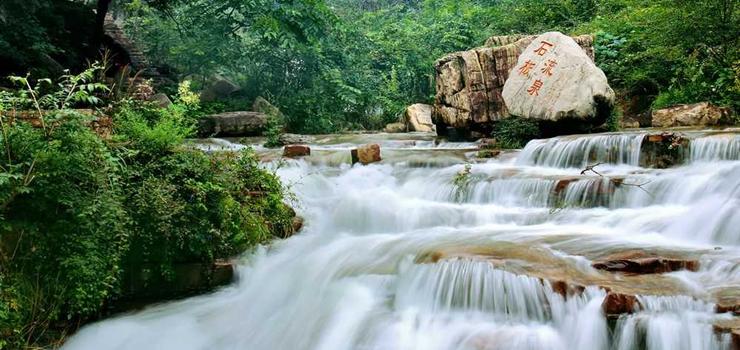 石板流泉水清如境,一百余米的清泉,從石板上流過,兩旁懸崖對出,樹木蒼郁,太陽從樹蔭間照射石上,水波粼粼,閃光耀彩,在這里人們可做、可臥、可吟、可殤,大有王維“明月松間照,清泉石上流”的意境。