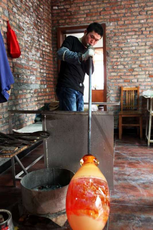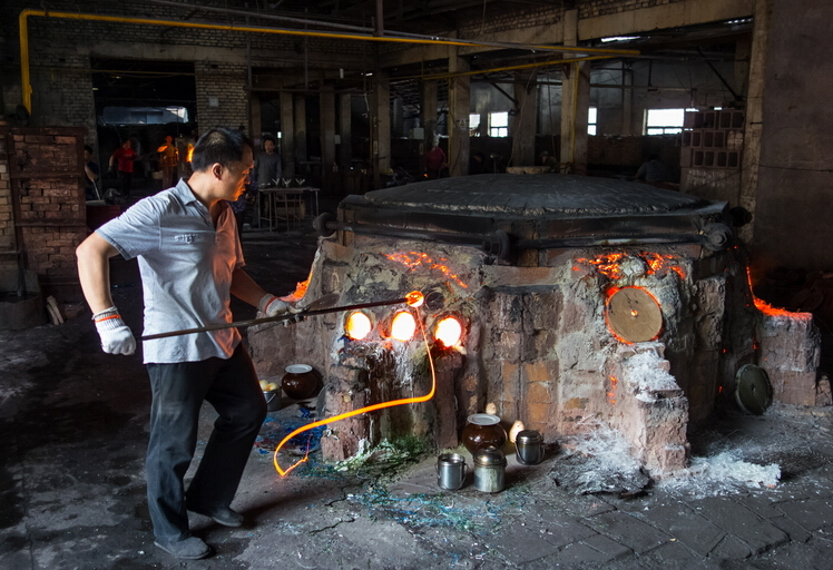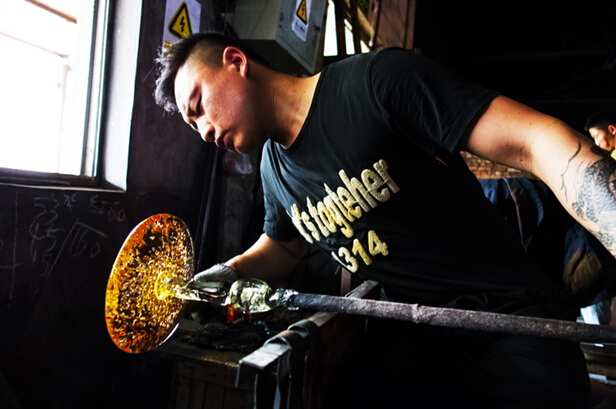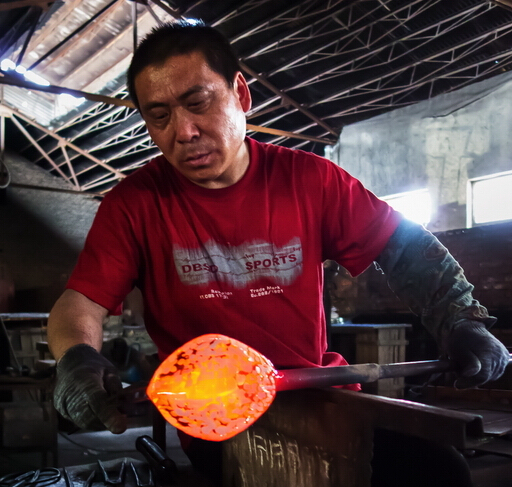 全程拍攝大爐琉璃制作,博山是琉璃之鄉(xiāng),保留傳承了琉璃加工的傳統(tǒng)技藝,并在此基礎(chǔ)上又自己的開拓創(chuàng)新。琉璃的制作工藝相當復(fù)雜,火里來、水里去,要幾十道工序才能完成,古法琉璃的精品制作,相當費時,有的光制作過程就要十幾二十天,而且主要依靠手工制作。八卦爐,爐里的溫度在1400-1600度,工作車間內(nèi)的溫度能達到50攝氏度左右。還有傳說琉璃是一個叫路申的博山人在用八卦爐煉丹的時候偶然發(fā)現(xiàn)的,觀其在經(jīng)過烈火煅燒之后還可以晶瑩剔透,遂以長生不老之丹為名進獻給當時的國君,并置于朝堂以消滅災(zāi)禍。所以佩戴琉璃小飾品還有去災(zāi)避禍的用處。大師提取原料吹制的過程,都是大師們用空心的管根據(jù)顏色的需要從爐口中提取,然后用空心管吹制。在吹制的過程中,溫度就會下降,然后再上回溫爐進行加工。