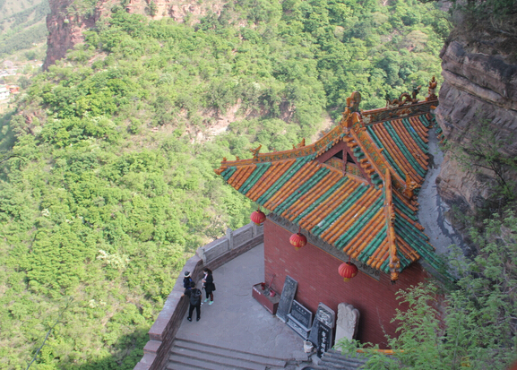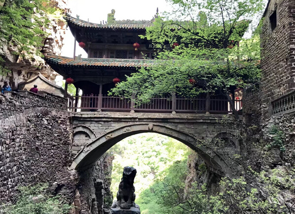 一絕“橋樓殿”。橋凌駕于百仞峭壁之間,仰視藍(lán)天一線,俯首萬丈深淵。形制如同趙州橋敞肩拱式。橋上建樓,云飛樓動,樓內(nèi)建殿,殿內(nèi)三尊大佛。真是“千丈虹橋望入微,天光云彩共樓飛”,不是仙境勝似仙境,疑是天堂落塵?!,F(xiàn)為中國三大懸空寺之一。
