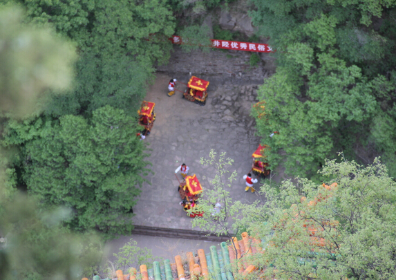 演駕隊伍浩浩蕩蕩,途經(jīng)村莊皆夾道相迎,鑾駕一到,路旁眾人就地跪拜,恭送過村。鑾駕到蒼巖山下胡家灘村口,又放三聲大炮,蒼巖山福慶寺內(nèi)眾僧徒恭候在山門口,簡短的接駕儀式后,馬子頭前飛巖走壁,在蒼巖山一尺多寬的懸崖邊的圍墻上快跑三個來回,方才完成使命,最后再把鑾駕護(hù)送至山上的公主祠內(nèi)。
