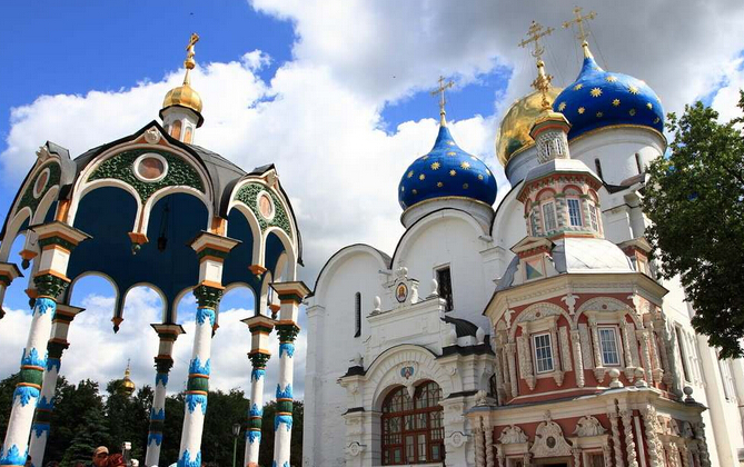 早餐后乘車前往宗教圣地-謝爾蓋耶夫鎮(zhèn),謝爾蓋耶夫鎮(zhèn)又名為扎戈?duì)査箍?。莫斯科的衛(wèi)星城市之一,位于市區(qū)東北71千米處。是一座風(fēng)景如畫,建筑獨(dú)特的城市,也是俄羅斯金環(huán)城市之一。抵達(dá)后參觀謝爾蓋三圣大修道院是俄羅斯著名最古老的大修道院之一 ,亦譯特羅伊察修道院。1337年一個(gè)名叫謝爾蓋·拉多涅日斯基的僧侶在莫斯科近郊謝爾蓋耶夫(即今扎戈?duì)査箍耍┑钠掷锝⒁蛔バ〗烫煤托〉婪浚瑸樵撔薜涝旱那吧?。后來凡愿在此出家的人,必須自造小道房并自辟膳食用地,由此發(fā)展而成為東北羅斯最富有的大修道院。1744年獲大修道院稱號(hào),是東北羅斯古典建筑群的代表。修道院石墻高達(dá)15米,成為莫斯科北方重要防御據(jù)點(diǎn)。它擁有幾個(gè)世紀(jì)以來、歷經(jīng)各個(gè)朝代改建和擴(kuò)建的各種形式的教堂和附屬建筑群。包括三圣教堂、杜霍夫斯基降靈教堂、圣母升天教堂,教皇宮殿和斯摩棱斯克教堂(1748年),以及齋房、鐘樓、慈善醫(yī)院等。其中最著名的三圣教堂建于1423-1442年,是俄羅斯早期白石建筑藝術(shù)典范。在這里可以看到以畫《三位一體》而出名的俄羅斯畫家安德烈·魯布廖夫的壁畫作品等。