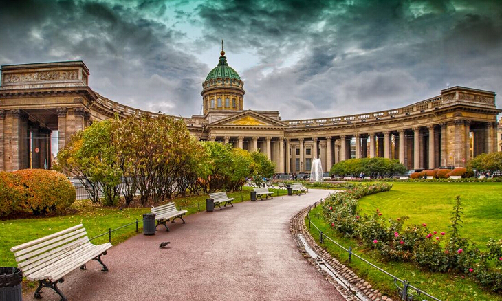 喀山教堂:(外觀)建于19世紀(jì)初期,由當(dāng)時(shí)的沙皇保羅一世下令修建,其目的是為安置神奇之作——《喀山圣母像》。教堂最顯著的特征是它有一個(gè)呈半圓形的柱廊,柱廊的后面露出高達(dá)70米的教堂圓頂。教堂明亮、輕快,中央穹頂輝煌華麗。