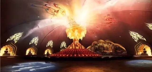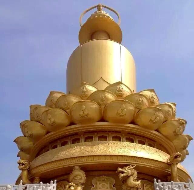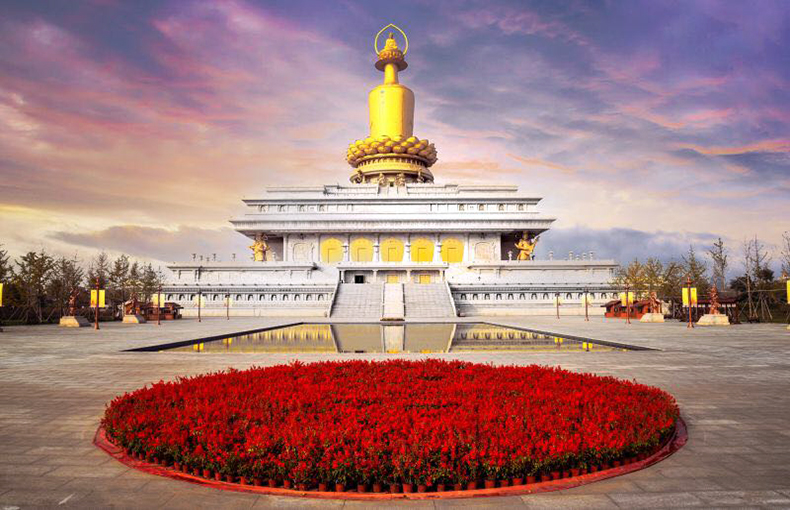 山東省濟(jì)寧市兗州區(qū)興隆文化園(大興隆寺)景區(qū)內(nèi),有一座宏偉的靈魂中心建筑——高達(dá)118米的靈光寶殿,共分九層。上部金瓶聳然矗立在金蓮花須彌臺(tái)上,氣勢(shì)雄偉、莊嚴(yán)神圣,其中安奉著興隆塔地宮出土的世尊金頂骨真身舍利;下部借鑒了釋迦牟尼壇城的形制,氣勢(shì)磅礴象征佛祖的智慧浩瀚無邊與獨(dú)特深厚的佛教壇城理念交相輝映。