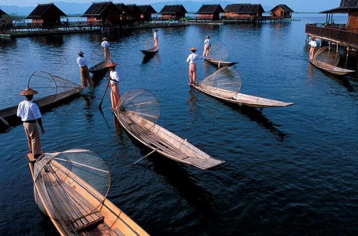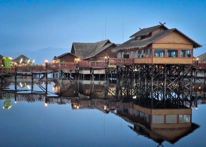 飯店內(nèi)早餐后,乘坐當(dāng)?shù)靥厣未斡[風(fēng)光旖旎的茵萊湖。茵萊湖是緬甸第二大湖,三面環(huán)山,水質(zhì)清澈,湖底水草清晰可見,湖水的顏色隨著每天日出日落而發(fā)生變化。當(dāng)?shù)匾疬_(dá)族人的村寨依湖而建,高腳屋、學(xué)校、商店等各種生活設(shè)施均佇立水中,當(dāng)?shù)厝说娘嬍称鹁泳篮?,交通往來全依靠船只,是名副其?shí)的水上村寨。當(dāng)?shù)厝颂赜械膭澊绞绞钦驹诖?,手腳并用的劃船。乘船參觀坐落在湖上的【水中佛塔】,在此可以欣賞俗稱【貓?zhí)?/strong>】的【波道烏寺】中的緬甸貓?jiān)谒轮猩说挠?xùn)練下,可以為游人表演鉆圈,寺中的五世佛像是艷麗湖的至尊,寺中的佛塔金光燦燦,全寺全部由柚木建成,木雕技藝精湛,其本身就是一座藝術(shù)寶庫(kù);參觀水上【手工織布制衣作坊】、【卷煙作坊】、【鐵器生產(chǎn)作坊】,與【長(zhǎng)頸族家庭】拍照,參觀當(dāng)?shù)孛恐芤淮蔚募小?strong>水上市場(chǎng)】,領(lǐng)略緬甸獨(dú)特的水上村寨生活。午餐在風(fēng)光奇美的【水上餐廳】用餐,品嘗湖中的特產(chǎn)魚。晚入住水邊的木屋別墅。