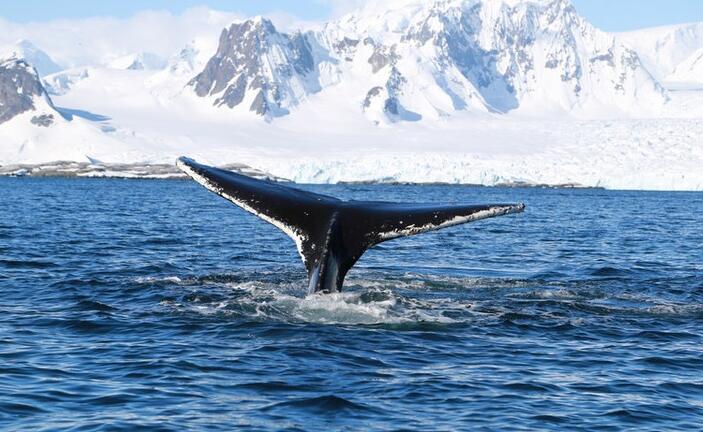 在南極的潘諾拉航道上,彼得曼島是最精彩的風(fēng)景,因為可以看到海中王者-鯨魚。彼得曼島附近總有鯨魚出沒,它們巨大的身姿隱藏在這片深邃極冷的海中。