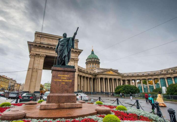 【喀山大教堂】(外觀(guān)約10分鐘)俄羅斯第一座由俄羅斯建筑師修建的歐洲風(fēng)格的教堂,也是圣彼得堡最靈驗(yàn)的東正教教堂。半圓型的柱廊由94根圓柱組成,面向大街,環(huán)抱廣場(chǎng)。柱廊前面矗立著俄軍統(tǒng)帥庫(kù)圖佐夫紀(jì)念碑和俄國(guó)陸軍元帥紀(jì)念碑。教堂里有庫(kù)圖佐夫墓和1812年打敗拿破侖的勝利品。喀山圣母像曾經(jīng)多次顯靈。第一次顯靈于伊凡雷帝時(shí)期。