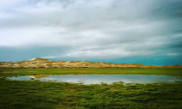 經(jīng)過(guò)小半程的徒步,會(huì)遇到一座極高的沙丘,翻越沙丘后豁然開(kāi)朗。你會(huì)驚訝于沙漠的洪荒世界居然有如此的世外桃源,寧?kù)o的湖泊被浩浩蕩蕩的綠洲包圍著,湖畔生長(zhǎng)著沙漠腹地極罕見(jiàn)的小樹(shù)林,生機(jī)盎然。