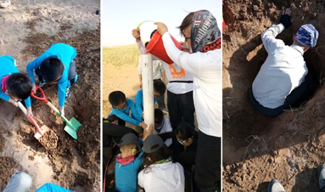 沙漠湖畔,是打井的理想之地,齊心協(xié)力挖沙,很快就會(huì)有地下水滲出,輕輕松松收集三大桶水。收集好了水,然后上道具,塑料管、乒乓球還有大朋友小朋友的齊心協(xié)力,沙漠甘泉游戲,搞定。