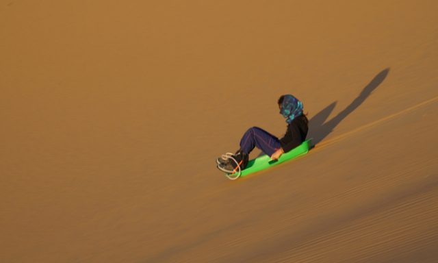 沙漠的山丘每天都在變,一陣狂風(fēng)之后,原本的平底會(huì)突然變成一個(gè)沙丘,這樣的沙丘到處都是,滑沙就是沙漠最有樂(lè)趣的事情!