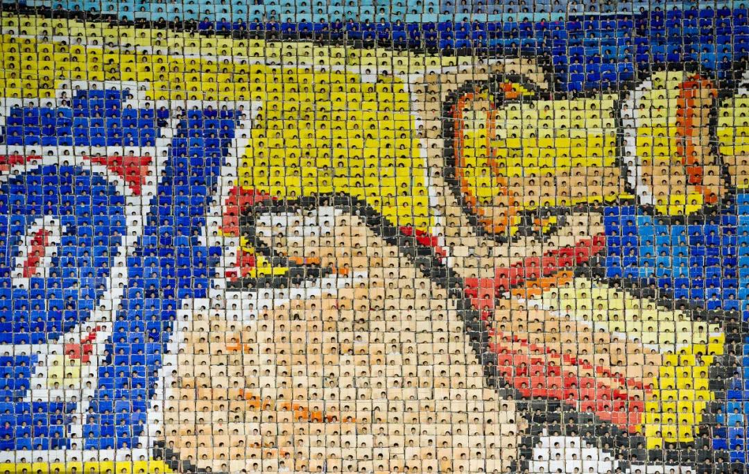 背景變換由朝鮮的小學生們手舉彩色翻板組成