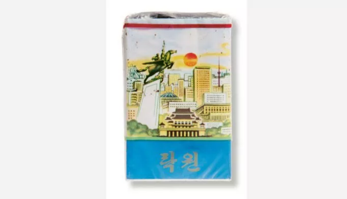 煙盒包裝上描繪的平壤景觀,包括著名的千里馬雕像