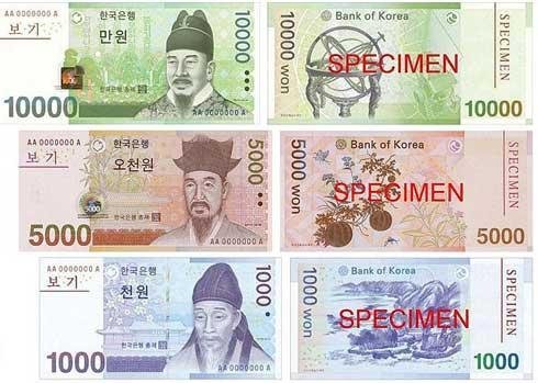 貨幣的基本單位 - 元(WON)。 貨幣種類 - 紙鈔有 1,000 、 5,000 、 10,000韓元 3 種。 硬幣有 1 、 5 、 10 、 50 、 100 、 500 元 6 種。 美元和旅行支票可在機(jī)場(chǎng)內(nèi)的銀行、飯店內(nèi)的兌換窗口、市中心的一般銀行兌換。