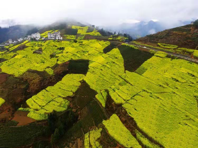 金燦燦的油菜花與綠油油的麥苗黃綠相間