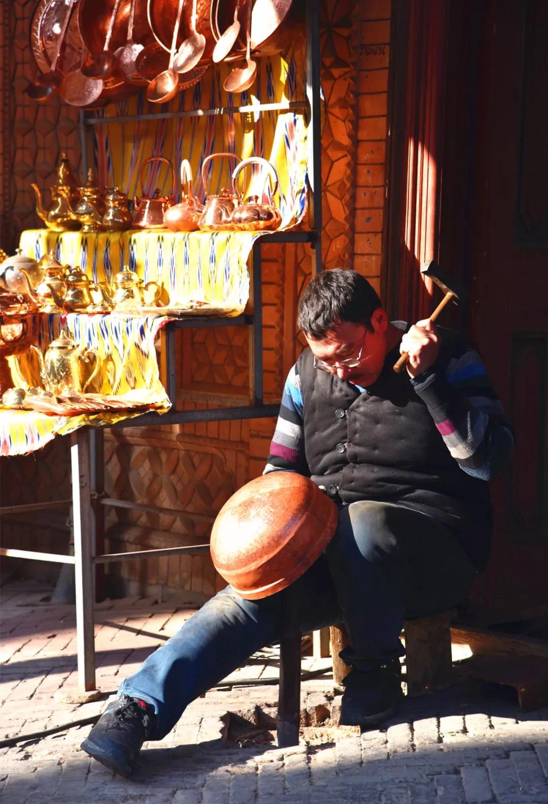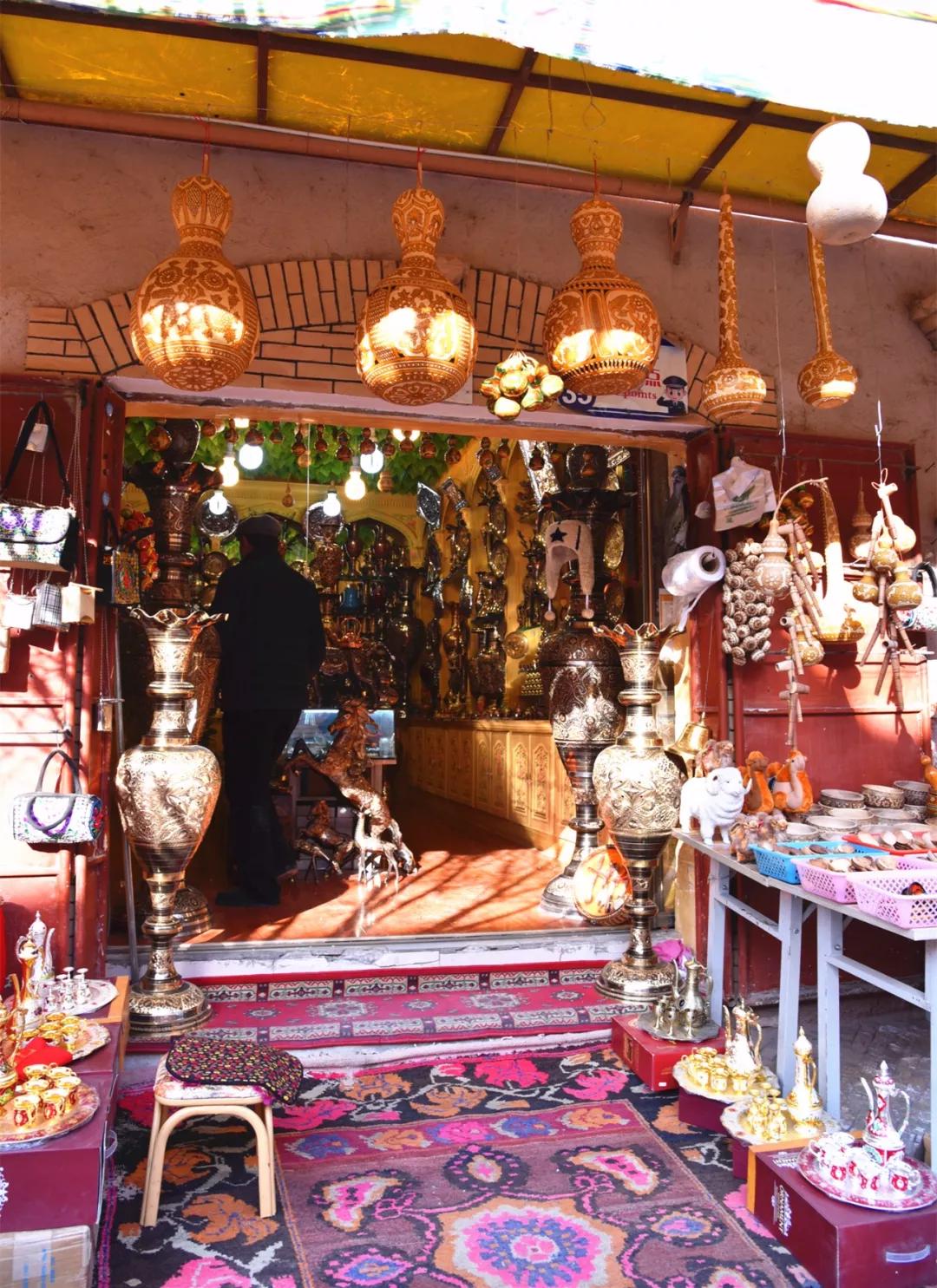 沿街開有各種店鋪。鞋帽、玉器、五金、工藝品都有,富有韻味,感興趣的可以駐足選購(gòu)。祖祖輩輩生活在這里的居民,也在老城改造后加快了脫貧致富的步伐。在古城城門附近,有一個(gè)迷人的“花盆巴扎”。巴扎是老城的靈魂,幾乎每一條街道都有自己的巴扎主題。譬如坎土曼巴扎(鐵匠街)、朵帕巴扎(花帽街)、菜巴扎、油巴扎、肉巴扎、手工藝品巴扎、陶器巴扎等,各有特色。