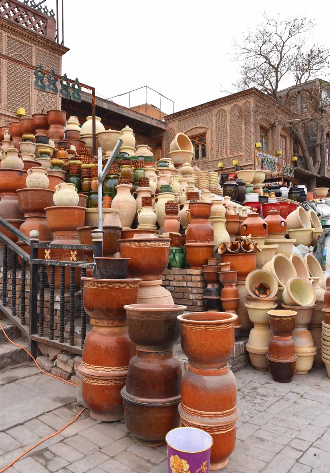 2、花盆巴扎喀什古城城門南側(cè),是花盆巴扎,巴扎入口處是彩陶墻,琳瑯滿目的陶器,讓人贊嘆不已??κ餐撂找脖环Q為“泥巴藝術(shù)”,器型主要以碗、碟、盤、壺等生活器具為主。(“巴扎”是維吾爾語,翻譯過來是集市的意思。)