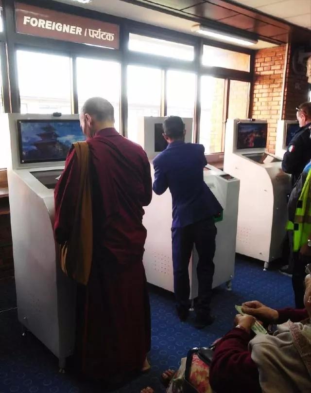 在“VISA APPLICATION”的指引牌的引導(dǎo)下,你就會(huì)發(fā)現(xiàn)很多臺(tái)下圖的申請落地簽的電子設(shè)備,正常的機(jī)器屏幕上會(huì)顯示“Welcome to the Department of Immigration,Nepal",根據(jù)屏幕指示點(diǎn)擊進(jìn)入到下一個(gè)環(huán)節(jié)!