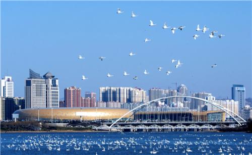 后參觀【天鵝湖國(guó)際城市濕地公園】,位于三門(mén)峽市東西城區(qū)之間的生態(tài)區(qū)內(nèi),現(xiàn)有面積8850畝,其中陸地6150畝,水面、灘涂2700畝,核心景區(qū)包括雙龍湖白天鵝觀賞區(qū)、陜州古城和沿黃生態(tài)林帶三部分,是一處融生態(tài)、文化和人文地理于一體的自然山水;
