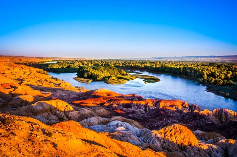五彩灘風(fēng)景區(qū)前有大型的風(fēng)力發(fā)電網(wǎng)站。北岸山勢起伏、顏色多變,其是由激猛的流河侵蝕切割以及狂風(fēng)侵蝕作用而共同形成。由于河岸巖層間抗風(fēng)化能力的強(qiáng)弱程度不一而形成了參差不齊的輪廓,這里的巖石顏色多變,且在落日時分的陽光照射下,巖石的色彩以紅色為主,間以綠、紫、黃、白、黑及過渡色彩,色彩斑斕。每當(dāng)刮風(fēng)的時候,溝壑里、巖石下,到處都會發(fā)出長短不一、高低不同的怪叫聲。