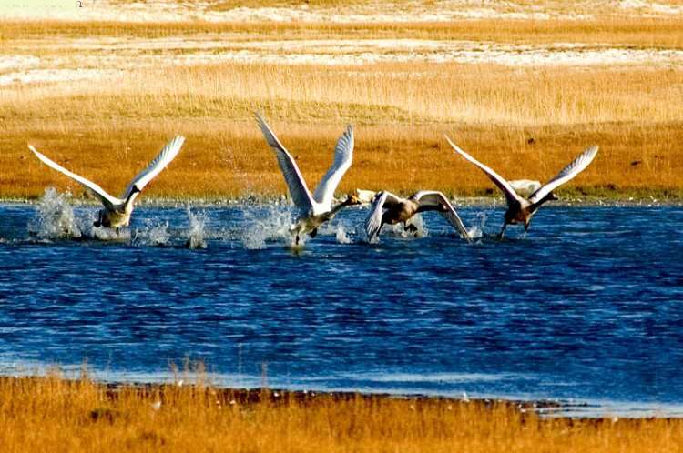 每逢春末夏初,冰雪消融,大地復(fù)蘇,旅居在印度、緬甸、巴基斯坦甚至遠(yuǎn)到紅海和地中海沿岸諸國的天鵝和雁鷗,不遠(yuǎn)千里成群結(jié)隊(duì)地飛到這里 筑巢、換羽、求偶、生兒育女、棲息繁衍。這就是我國著名的巴音布魯克天鵝湖自然保護(hù)區(qū)。